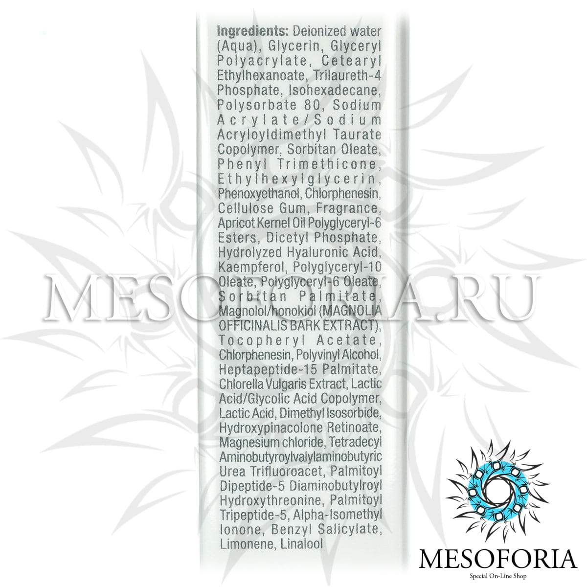 Активные ингредиенты: глицерин, изогексадекан, этилгексилглицерин, хлорфенезин, целлюлоза, масло абрикосовых косточек (полиглицериловый эфир), гидролизованная гиалуроновая кислота, кемпферол, экстракт коры магнолии, токоферола ацетат, гептапептид-15 пальмитат, экстракт хлореллы, сополимер молочной кислоты/ гликолевой кислоты, молочная кислота, гидроксипинаколона ретиноат, тетрадецил аминобутиролвалиламинобутирик мочевины трифторацетат, пальмитоил дипептид-5 диаминобутироил гидрокситреонин, пальмитоил трипептид-5.