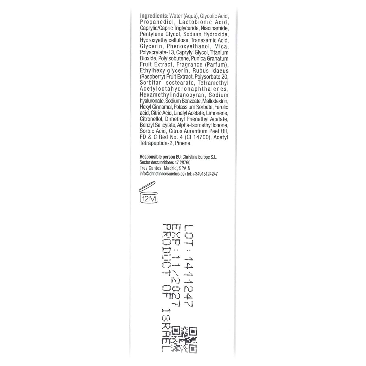 Состав:Water (Aqua), Glycolic Acid, Propanediol, Lactobionic Acid, Caprylic/Capric Triglyceride, Niacinamide, Pentylene Glycol, Sodium Hydroxide, Hydroxyethy|cellulose, Tranexamic Acid,Glycerin, Phenoxyethanol, Mica, Polyacrylate-13, Caprylyl Glycol, Titanium Dioxide, Polyisobutene, Punica Granatum Fruit Extract, Fragrance (Parfum), Ethylhexylglycerin, Rubus Idaeus (Raspberry) Fruit Extract, Polysorbate 20, Sorbitan Isostearate, Tetramethyl Acetyloctahydronaphthalenes, Hexamethylindanopyran,Sodium hyaluronate, Sodium Benzoate, Maltodextrin, Hexyl Cinnamal, Potassium Sorbate, Ferulic acid, Citric Acid, Linalyl Acetate, Limonene, Citronellol, Dimethyl Phenethyl Acetate, Benzyl Salicylate, Alpha-Isomethyl Ionon, Sorbic Acid, Citrus Aurantium Peel Oil FD & C Red No. 4 (CI 14700), Acetyl Tetrapeptide-2, Pinene.