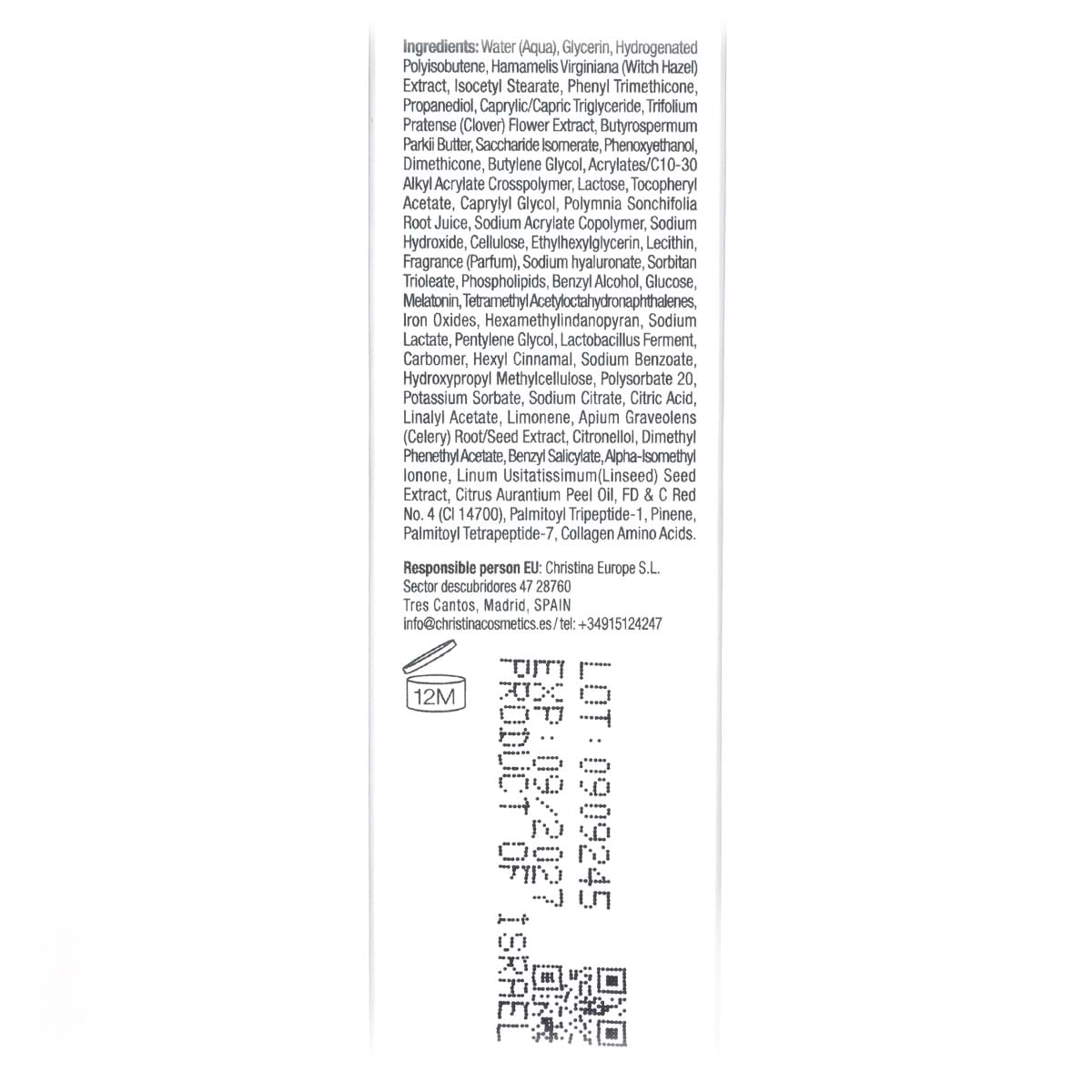 Вода, глицерин, экстракт гамамелиса виргинского, фенилтриметикон, экстракт красного клевера, масло ши, диметикон, токоферилацетат, сок корня якона, гиалуронат натрия, фосфолипиды, глюкоза, липосомальный мелатонин, оксид железа, фермент лактобактерий, лимонная кислота, экстракт семян льна, пальмитоил-трипептид-1, пальмитоилтетрапептид-7, аминокислоты коллагена.