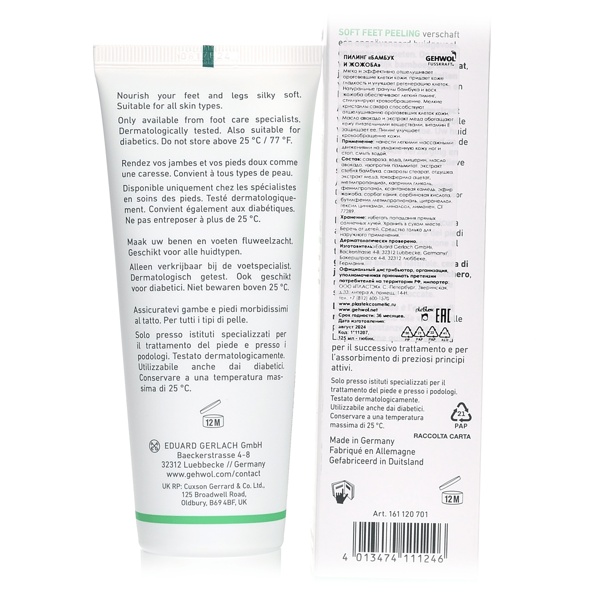 Пилинг «Бамбук и жожоба» Fusskraft Soft Feet Peeling Gehwol мягко и эффективно отшелушивает ороговевшие клетки кожи, придает коже гладкость и улучшает ее регенерацию. Натуральные гранулы бамбука и воск жожоба обеспечивают легкий и нежный пилинг, стимулируют кровообращение. Мелкие кристаллы сахара способствуют быстрому отшелушиванию ороговевших клеток кожи, мягко и бережно массируют кожу ног и стоп. Масло авокадо и экстракт меда обогащают кожу ценными питательными веществами, витамин Е защищает ее и предотвращает преждевременное старение. Пилинг улучшает кровообращение кожи и подготавливает её для дальнейшего ухода, обеспечивая лучшее впитывание ценных питательных веществ в кожу.