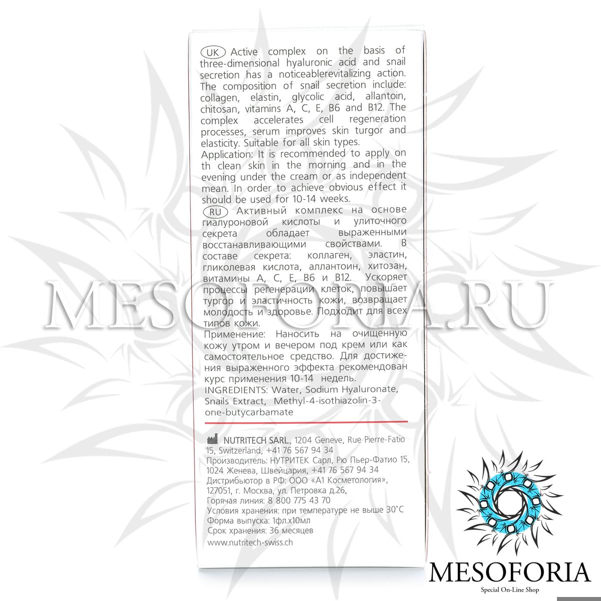 Результат применения: Кожа увлажнена и подтянута. Активные ингредиенты: Water, sodium hyaluronate, helix aspersa snail secretion. Способ применения: Наносить на очищенную кожу утром и вечером под крем или как самостоятельное средство. Экспресс-курс для косметических процедур: 5 процедур с интервалом 5 дней. Интенсивный курс от 2 до 6 месяцев. Перерыв между курсами - 3 месяца. Объем: 10 мл.Срок годности после вскрытия - 6 месяцев.