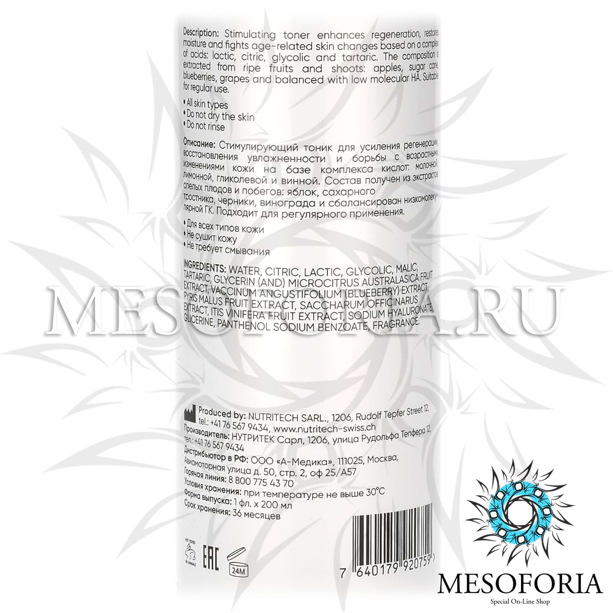 Тоник для усиления регенерации, восстановления увлажненности и борьбы с возрастными изменениями кожи на базе комплекса кислот: молочной, лимонной, гликолевой и винной. Состав получен из экстрактов спелых плодов и побегов: яблок, сахарного тростника, черники, винограда и сбалансирован низкомолекулярной ГК.