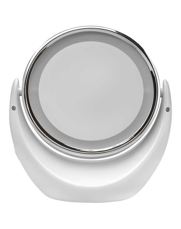 Компактное настольное косметологическое зеркало диаметром 13,4см с 5 кратным увеличением, круговой светодиодной подсветкой и вращающейся на 360⁰ зеркальной поверхностью.