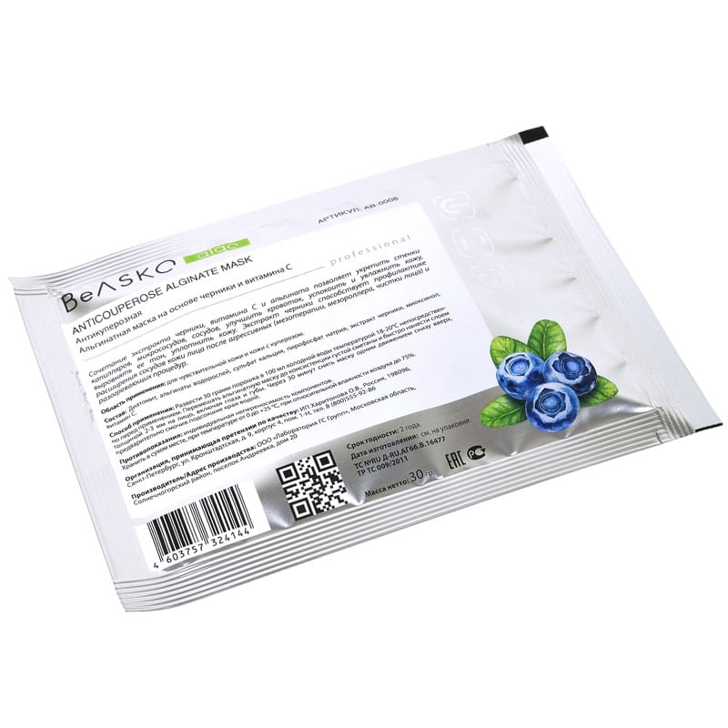 Альгинатная маска с антикуперозным комплексом на основе черники и витамина С / Anticouperose Alginate Mask, BeASKO - 6*30 гр