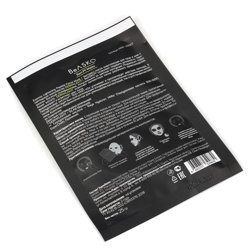 Экспресс-маска осветляющая для лица и шеи с пептидным комплексом DERMALIGHT / Express Lightening Peptide Facial Mask, Best PF Masks, BeASKO - 25 гр