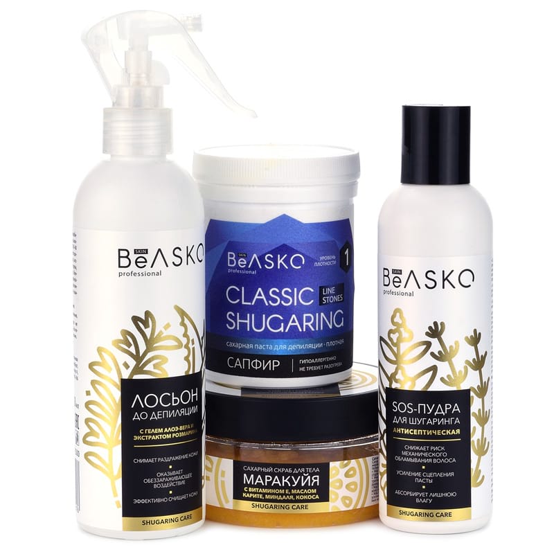 - Очищение кожи: обработать лосьон до депиляции с гелем алоэ-вера и экстрактом розмарина Shugaring Care BeASKO Skin,