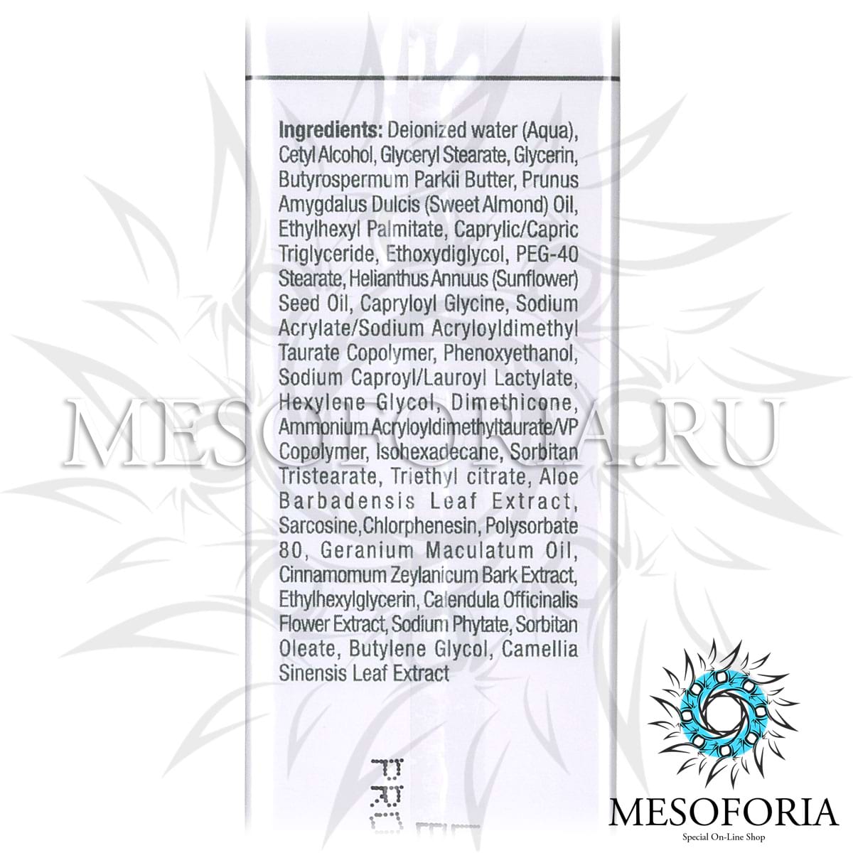 Активные ингредиенты: деионизированная вода, экстракт коры коричника цейлонского, саркозин, масло ши, масло сладкого миндаля, экстракт цветков календулы обыкновенной, масло семян подсолнечника, сок листьев алоэ барбадосского, мальтодекстрин, экстракт листьев камелии китайской, масло герани пятнистой.