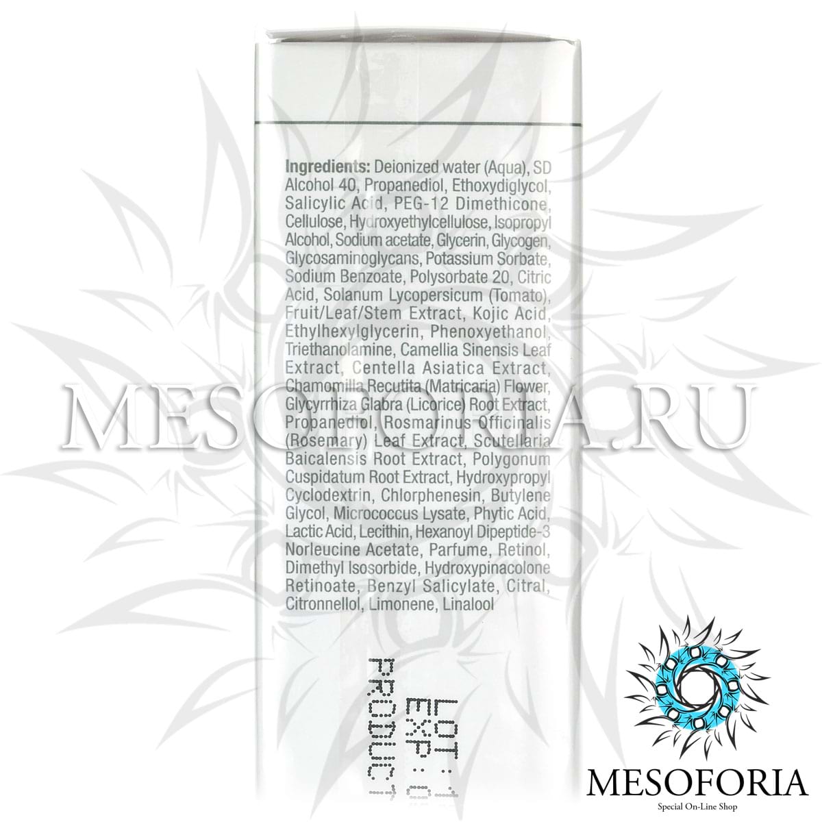 Активные ингредиенты: Пропандиол, салициловая кислота, гликоген, гликозаминогликаны, лимонная кислота, ликопин, койевая кислота, этилгексилглицерин, экстракт листьев зеленого чая, экстракт центеллы азиатской, цветки ромашки аптечной, экстракт корня солодки голой, экстракт листьев розмарина лекарственного, экстракт корня шлемника байкальского, экстракт корня горца гребенчатого, салициловая кислота, хлорфенезин, лизат микрококков, фитиновая кислота, лецитин, гексаноил дипептид-3 норлецин ацетат, молочная кислота, ретинол (0,025 %), гидроксипиноколона ретиноат.