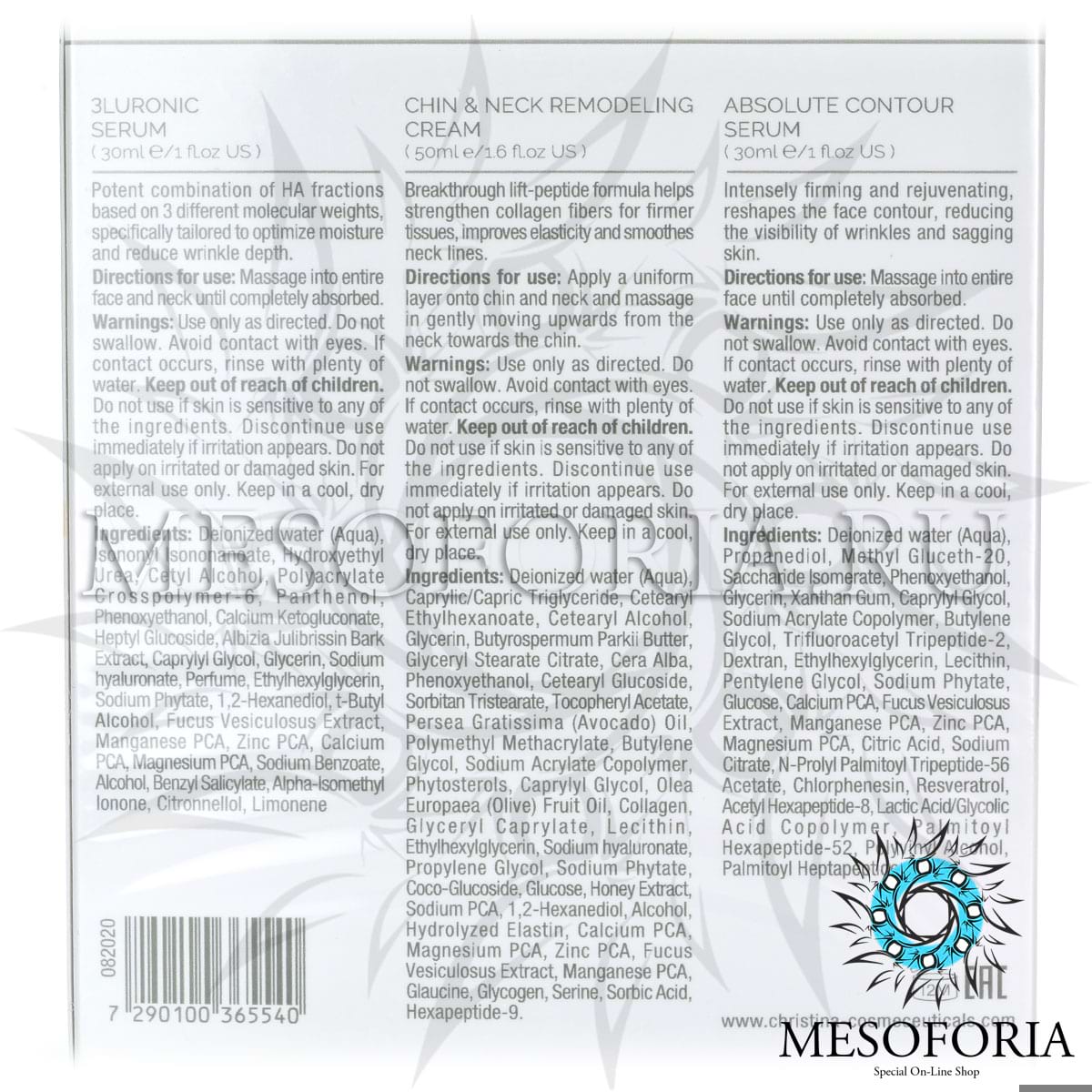 Forever Young-Absolute Contour Serum: Пропандиол, изомерат сахарида, ксантовая камедь, бутиленгликоль, трифторацетилтрипептид-2, декстран, этилгексилглицерин, лецитин, глюкоза, экстракт фукуса пузырчатого, лимонная кислота, N-пролилпальмитоил трипептид-56 ацетат, хлорфенезин, ресвератрол, ацетил гексапептид-8, сополимер молочной кислоты/ гликолевой кислоты, пальмитоил гексапептид-52, пальмитоил гептапептид-18.