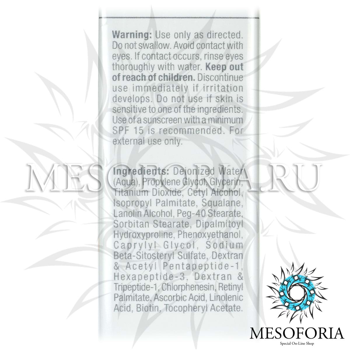 Активные ингредиенты: глицерин, диоксид титана, сквалан, дипальмитоил гидроксипролин, бета-ситостерол сульфат натрия, декстран, ацетил пентапептид-1, гексапептид-3, трипептид-1, ретинил пальмитат, аскорбиновая кислота (С), линоленовая кислота, биотин (В7), токоферола ацетат.