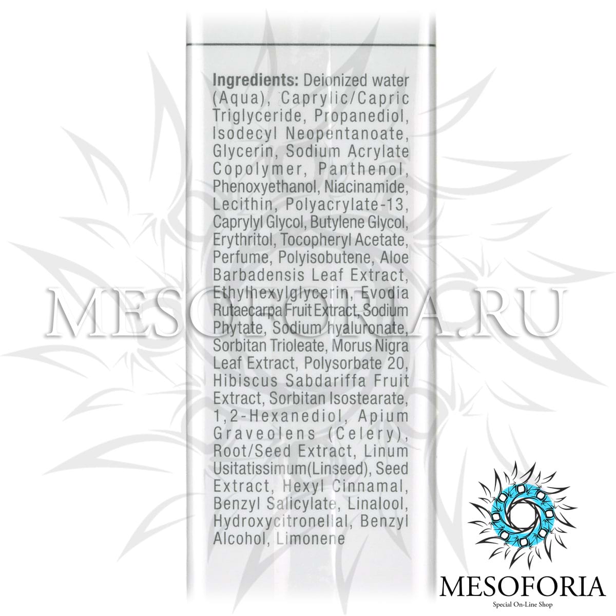 Активные ингредиенты: ниацинамид (витамин В3), витамин В5, комплекс Botanical hydrator, гиалуроновая кислота, деионизированная вода, глицерин, пантенол, лецитин, витамин Е, алоэ барбадосский, экстракт эводии рутоплодной, гиалуроновоя кислота, экстракт шелковицы, экстракт гибискуса, экстракт семян сельдерея.