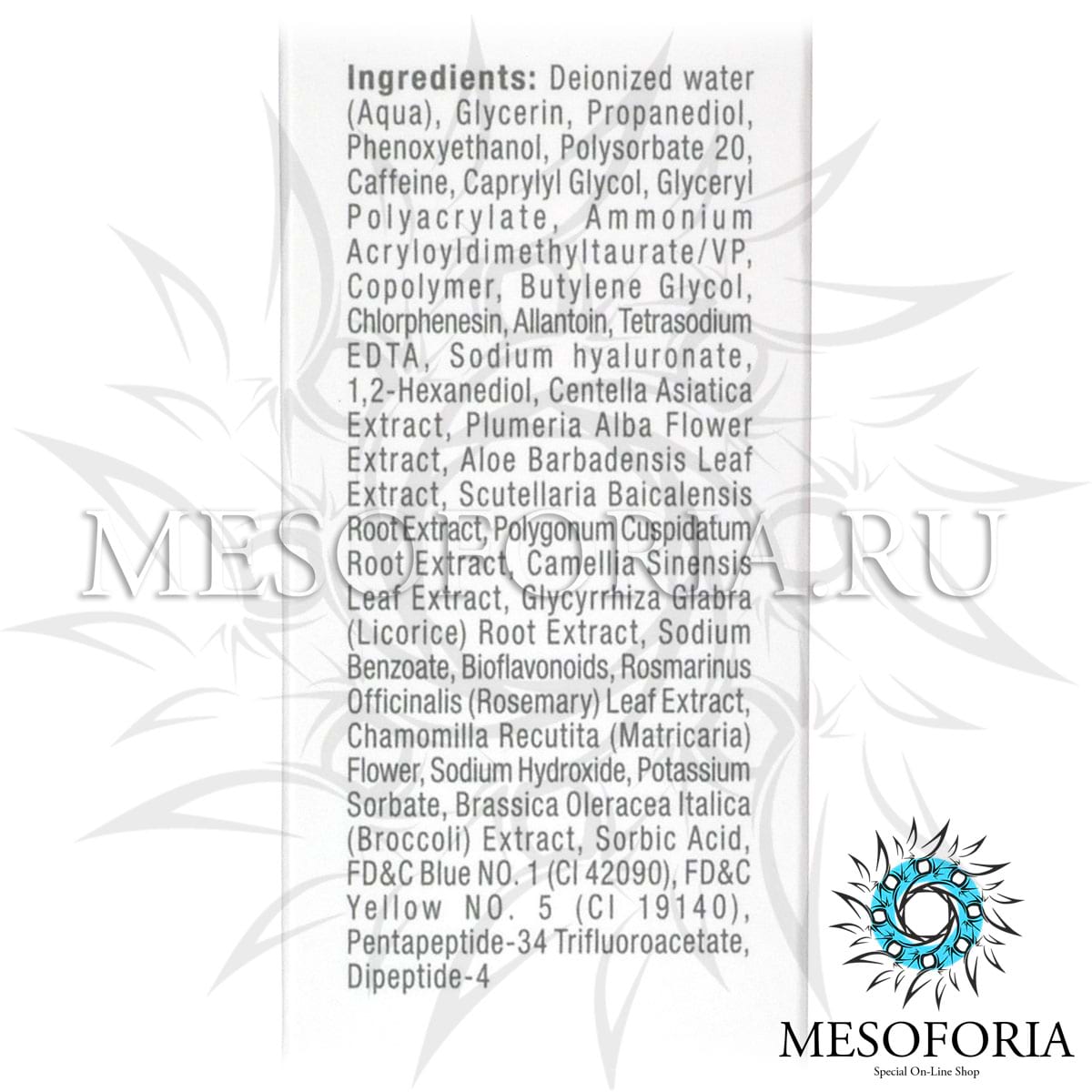 Глицерин, кофеин, аллантоин, натрия гиалуронат, экстракт центеллы азиатской, экстракт цветков плюмерии белой, экстракт листьев алоэ, экстракт корня шлемника байкальского, экстракт корня горца гребенчатого, экстракт листьев зеленого чая, экстракт корня солодки, биофлавоноиды, экстракт листьев розмарина, цветки ромашки, экстракт брокколи, пентапептид-34, дипептид-4.
