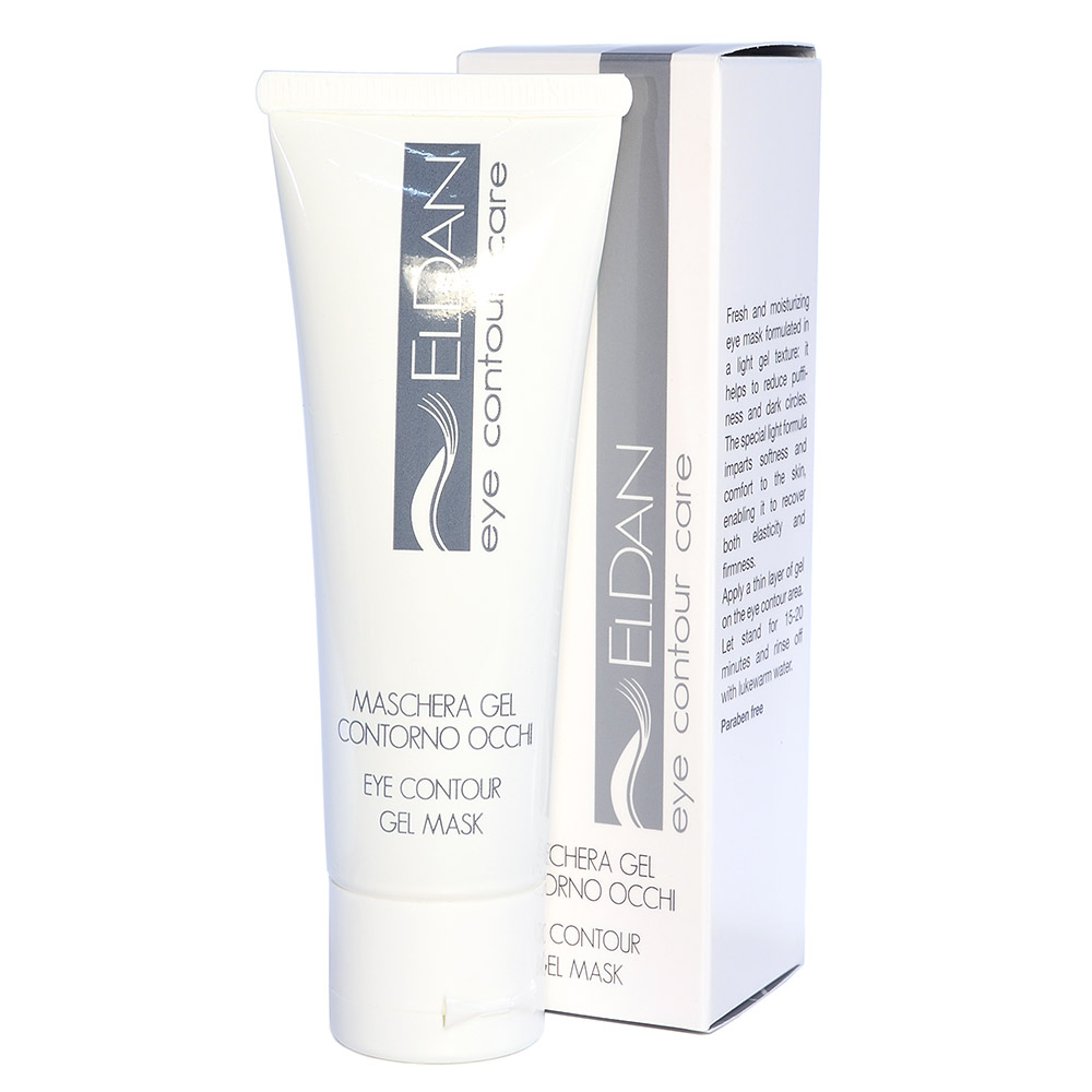 Интенсивно увлажняющая и восстанавливающая маска Eye Contour Gel Mask Eldan Cosmetics лёгкой гелевой текстуры с уникальным противоотечным эффектом. Входящие в состав средства активные ингредиенты: кофеин, экстракты колы и розмарина улучшают микроциркуляцию крови, уменьшая тёмные круги под глазами. Протеины сои и риса успокаивают чувствительную кожу век и восполняют дефицит влаги в коже. Оксидоредуктаза катализирует обменные процессы, нейтрализует действие свободных радикалов, защищая коллаген и эластин от разрушения. После применения гель-маски уменьшается выраженность морщин, заметно повышается упругость кожи.