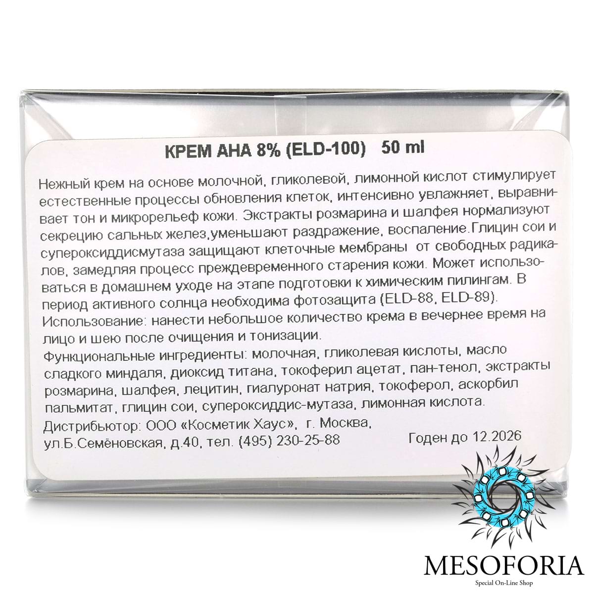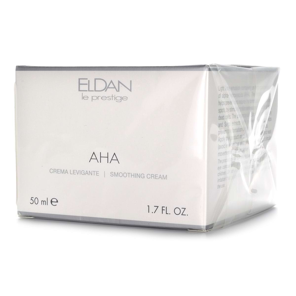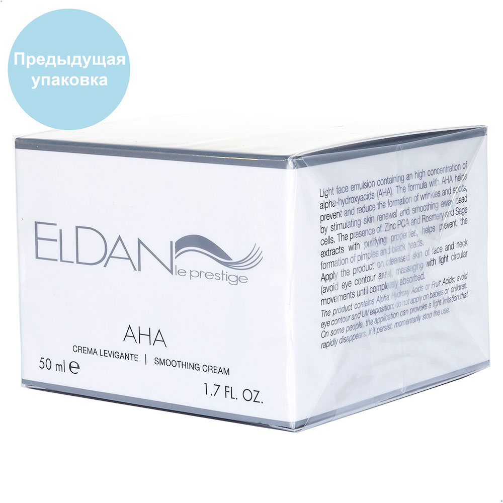 Высоактивный крем на основе AHA кислот AHA Smoothing Cream от бренда Eldan обладает мягким отшелушивающим, увлажняющим, отбеливающим и антисептическисм действием. Крем содержит молочную и гликолевую кислоты в концентрации 8%. Экстракты розмарина и шалфея в составе крема обладают дезинфицирующими свойствами, укрепляют местный иммунитет кожи. Препарат нейтрализует действие свободных радикалов, активизирует процесс восстановления клеток кожи. При регулярном применении исчезают мелкие морщинки, выравнивается тон кожи, уменьшаются проявления акне/постакне. Может использоваться в качестве подготовки к химическим пилингам. В летнее время необходима солнцезащита.