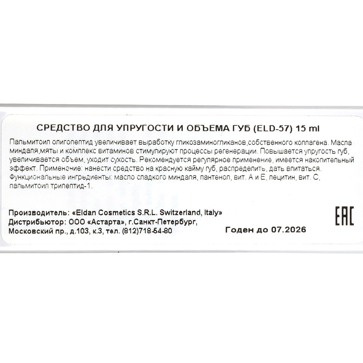 Революционное средство Lips Plumper Lips Treatment Premium Eldan для увеличения объема губ и придания им соблазнительных очертаний. Основано на уникальных свойствах пальмитоил олигопептида, способного многократно увеличивать выработку гликозамингликанов и собственного коллагена в коже. Активные ингредиенты: масла миндаля и мяты, а также комплекс витаминов стимулируют процесс обновления клеток, моментально корректируя мелкие морщинки и устраняя шелушения. В результате применения повышается упругость губ, значительно увеличивается их объем, улучшается цвет, уходит сухость, контур становится более четким. Рекомендуется регулярное применение, средство имеет накопительный эффект.