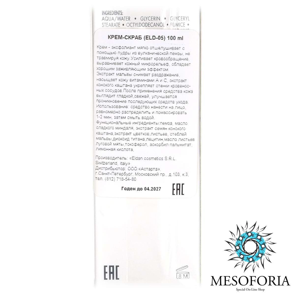 Крем - эксфолиант Exfoliating Cream Le Prestige Eldan Cosmetics мягко отшелушивает с помощью округлых полиэтиленовых гранул, не травмируя кожу. Усиливает кровообращение, выравнивает кожный микрорельеф, обладает хорошим заживляющим эффектом. Экстракт мальвы снимает раздражение, насыщает кожу витаминами А и С, экстракт конского каштана укрепляет стенки кровеносных сосудов. После применения средства кожа выглядит гладкой и свежей, улучшается проникновение последующих средств ухода.