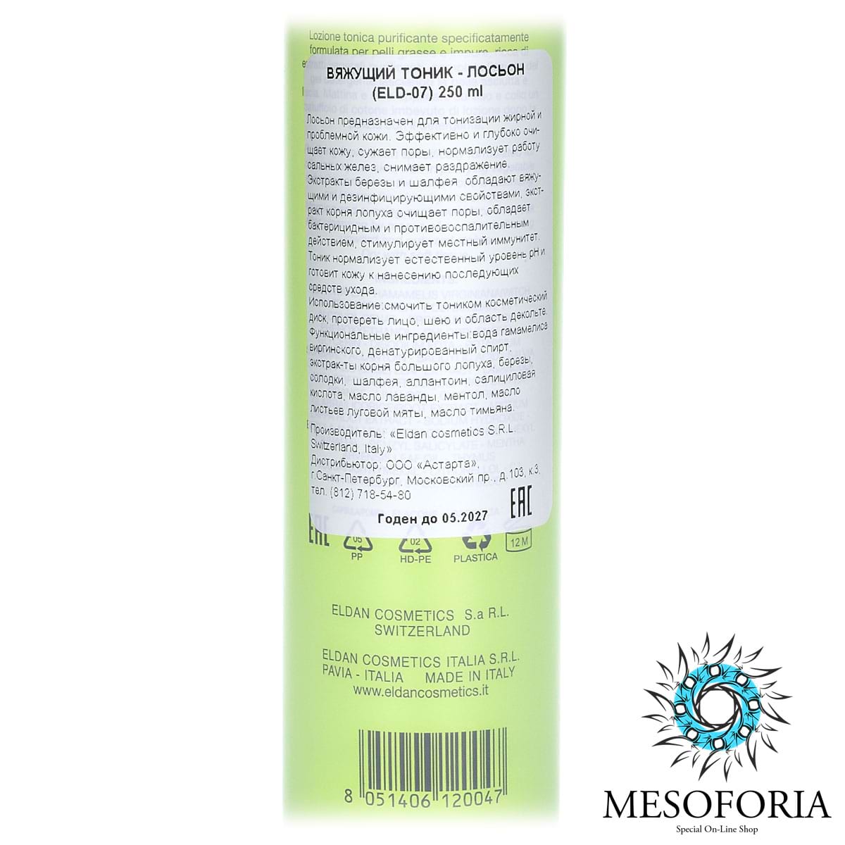 Лосьон Purifing Tonic Lotion Le Prestige Eldan Cosmetics предназначен для тонизации жирной и проблемной кожи. Эффективно и глубоко очищает кожу, сужает поры, нормализует работу сальных желез, снимает раздражение. Экстракты березы и шалфея обладают вяжущими и дезинфицирующими свойствами, экстракт корня лопуха очищает поры, обладает бактерицидным и противовоспалительным действием и стимулирует местный иммунитет. Тоник нормализует естественный уровень рН и готовит кожу к нанесению последующих средств ухода.