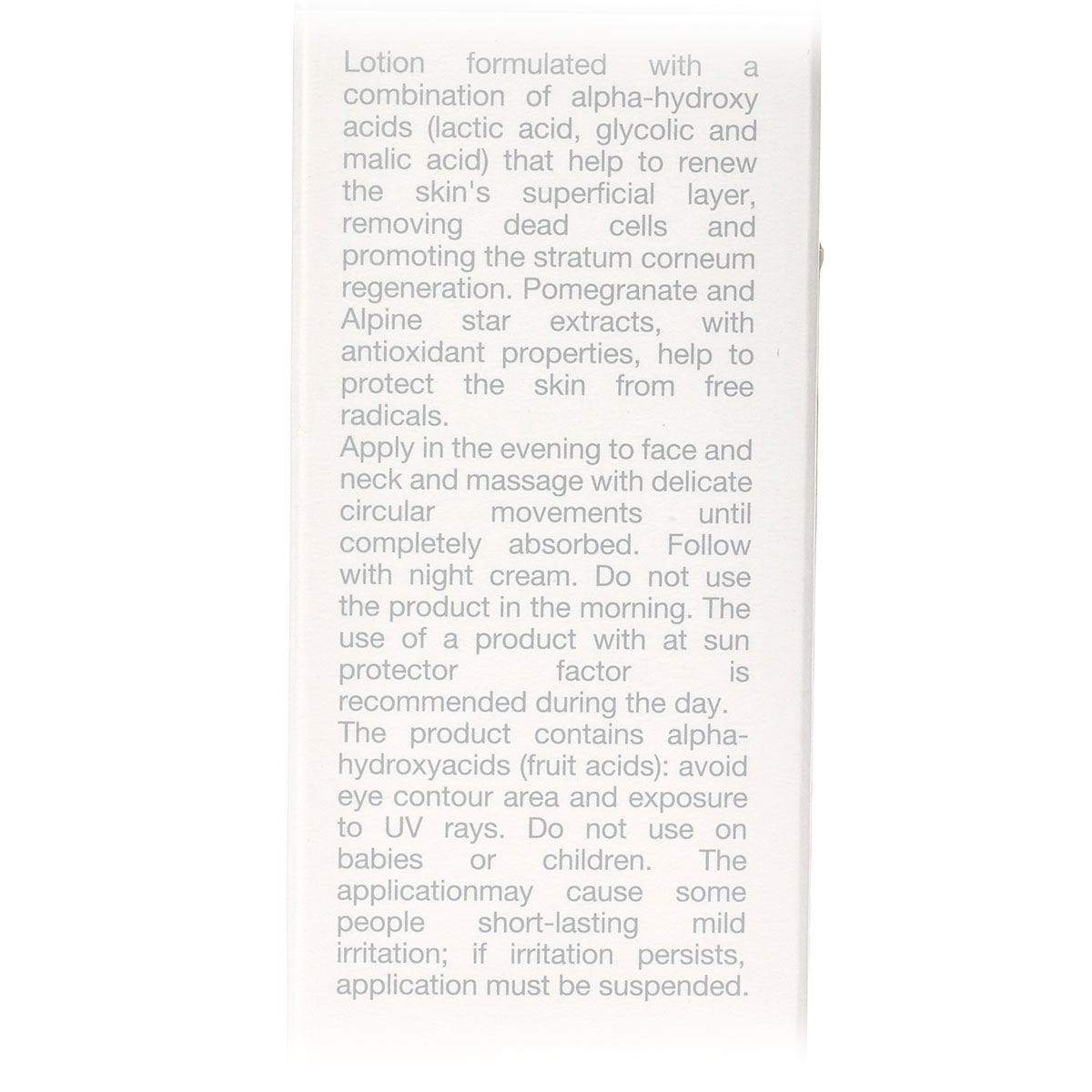 Активные ингредиенты: молочная кислота, гликолевая кислота, яблочная кислота, экстракт граната, экстракт эдельвейса, глицин сои, супероксиддисмутаза.
