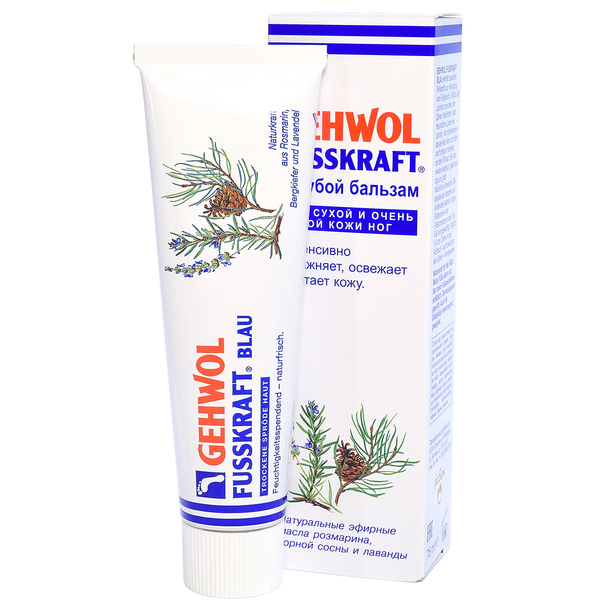 Голубой бальзам Fusskraft Blau Gehwol содержит ланолин в сочетании с алое-вера и мочевиной, которые обеспечивают необходимый уход за сухой, грубой и потрескавшейся кожей ног. Нормализует потоотделение и избавляет от неприятного запаха пота. Натуральные эфирные масла из розмарина, горной сосны и лаванды, камфара и охлаждающий ментол сразу же снимают ощущение жжения, тяжесть и боли в ногах.
