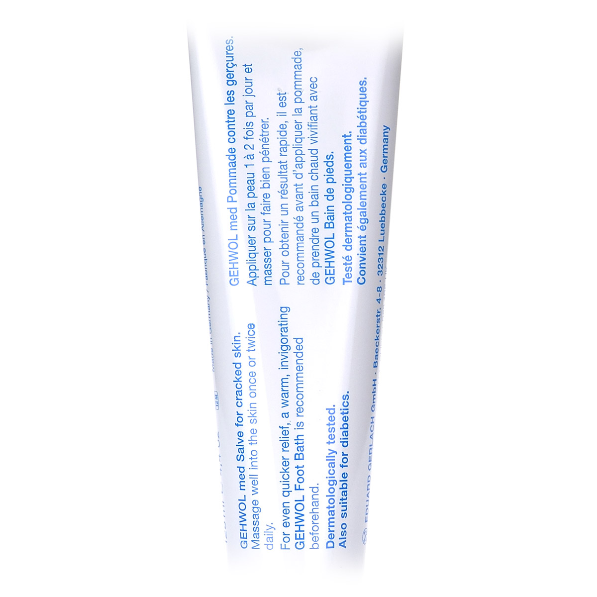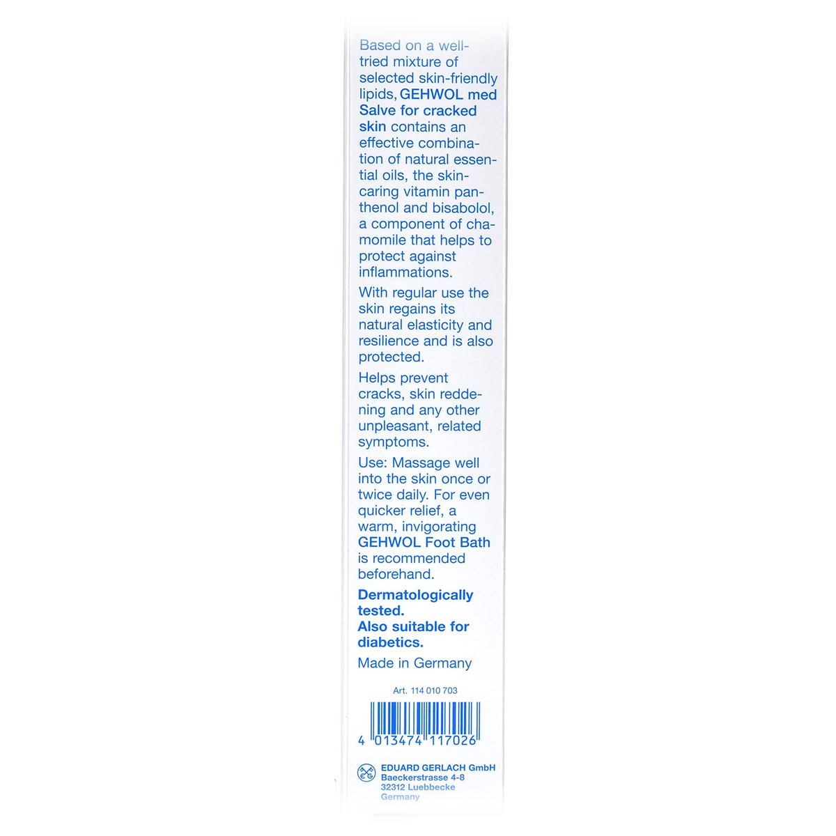 Мазь от трещин Med Schruden Salbe Gehwol для ухода за сильно загрубевшей, растрескавшейся, сухой и поврежденной кожей. Содержит в качестве основы специальное медицинское мыло и специально отобранную смягчающую и обладающую смягчающим эффектом комбинацию натуральных эфирных масел, витамина пантенол, ухаживающего за состоянием кожи, и противовоспалительное вещество бисаболол, получаемое из ромашки. При регулярном применении кожа приобретает естественную эластичность, стабильность и хорошо защищена. Особенно хорошо действует при шелушении кожи, покраснениях и сопутствующих неприятных осложнениях. Проверено по дерматологическим показателям. Благоприятно применение при заболевании диабетом.