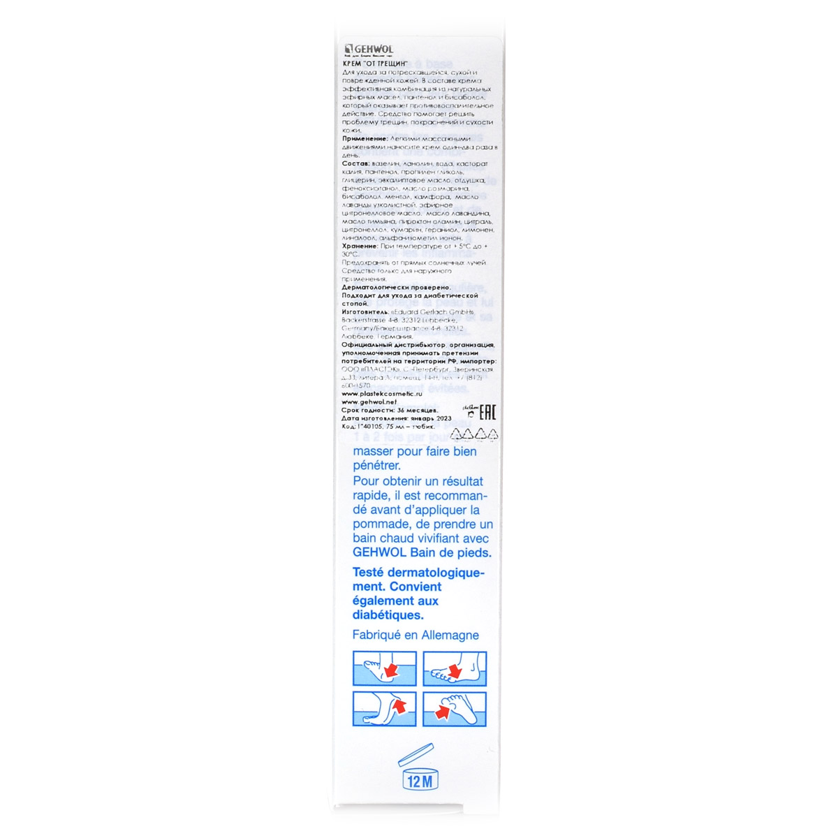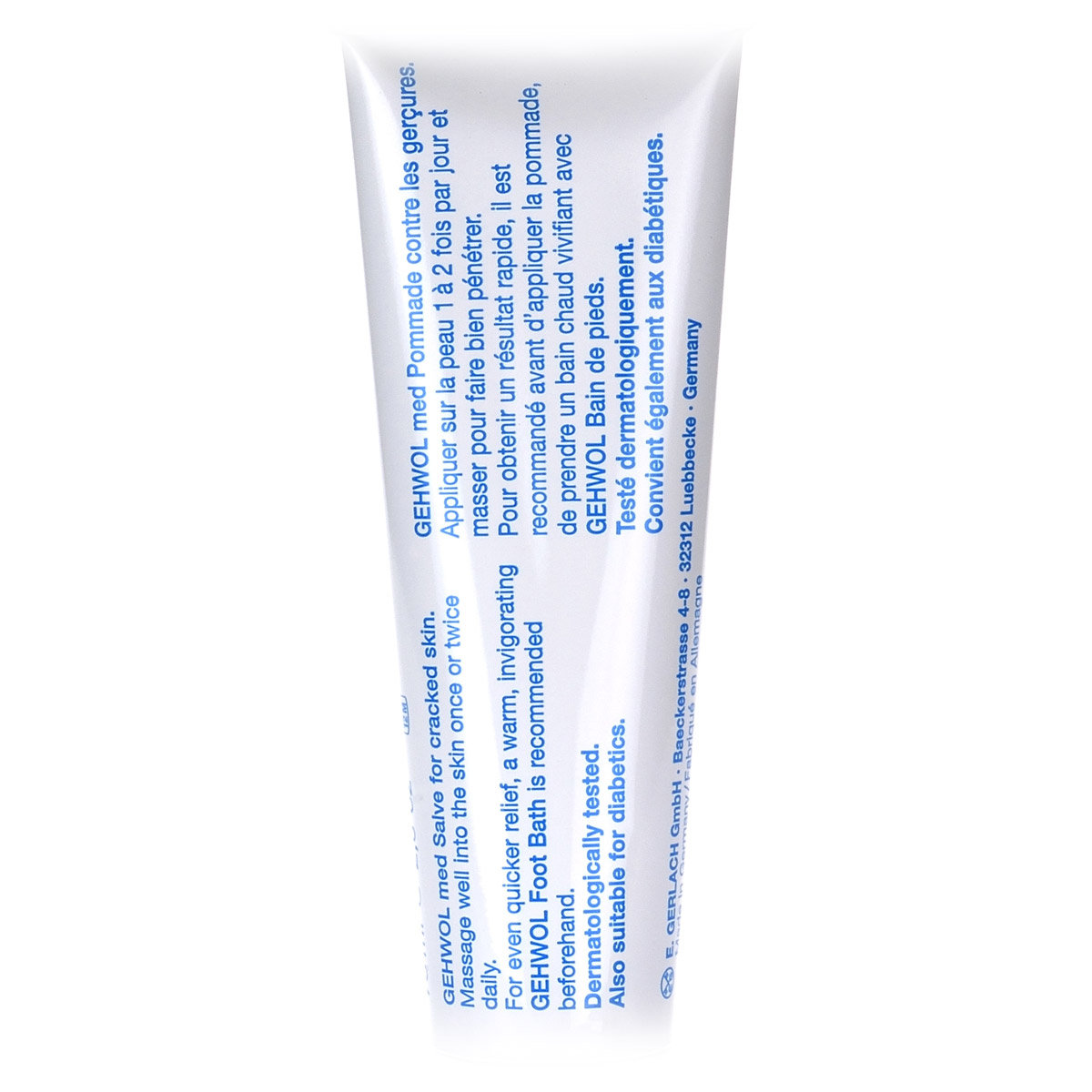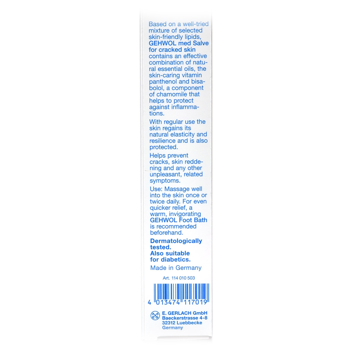 Мазь от трещин Med Schrunden Salbe Gehwol для ухода за сильно загрубевшей, растрескавшейся, сухой и поврежденной кожей. Содержит в качестве основы специальное медицинское мыло и специально отобранную смягчающую и обладающую смягчающим эффектом комбинацию натуральных эфирных масел, витамина пантенол, ухаживающего за состоянием кожи, и противовоспалительное вещество бисаболол, получаемое из ромашки. При регулярном применении кожа приобретает естественную эластичность, стабильность и хорошо защищена. Особенно хорошо действует при шелушении кожи, покраснениях и сопутствующих неприятных осложнениях. Проверено по дерматологическим показателям. Благоприятно применение при заболевании диабетом.