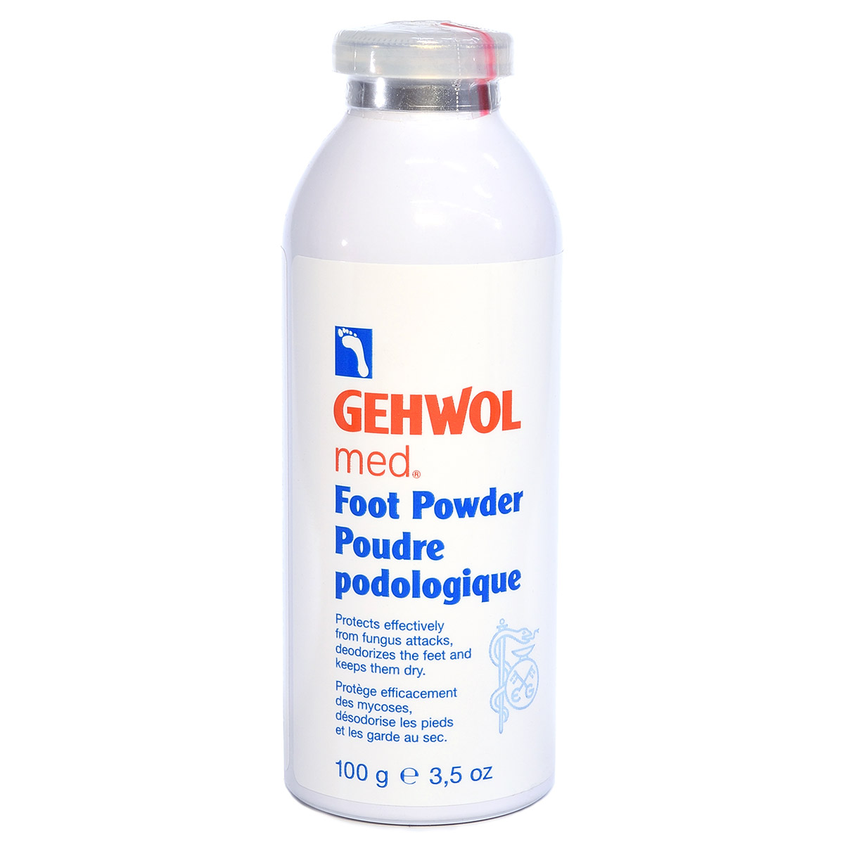 Пудра Med Foot Powder Gehwol для решения проблемы влажных ног (в составе оксид цинка), грибка и неприятного запаха. Пудра предупреждает болезни ног, связанные с излишком влаги и процессом разложения пота на поверхности кожи, препятствует раздражению и воспалению кожи ног. Она впитывает влагу с поверхности кожи и помогает сохранять ноги сухими, избавляет от неприятного запаха, дезодорируя кожу. Освежающие компоненты (ментол) создают ощущение легкости и прохлады. Пудра также придает коже ощущение нежности и бархатистости. Особенно рекомендуется как защитное от инфицирования средство в открытой обуви.
