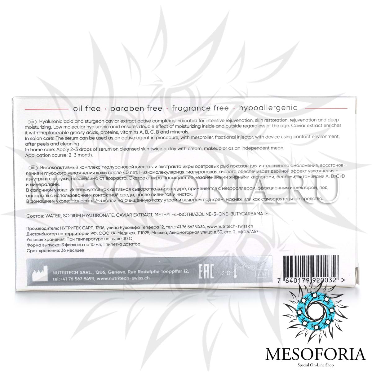 Высокоактивный комплекс гиалуроновой кислоты и экстракта икры осетровых рыб показан для интенсивного омоложения, восстановления и глубокого увлажнения кожи после лет. Низкомолекулярная гиалуроновая кислота обеспечивает двойной эффект увлажнения - изнутри и снаружи, независимо от возраста. Экстракт икры насыщает ее незаменимыми жирными кислотами, белками, витаминами A, B, C, D и минералами. Применять с 40 лет. Для достижения наилучшего эффекта желательно применение с мезороллером или при проведении микроигольчатой мезотерапии.