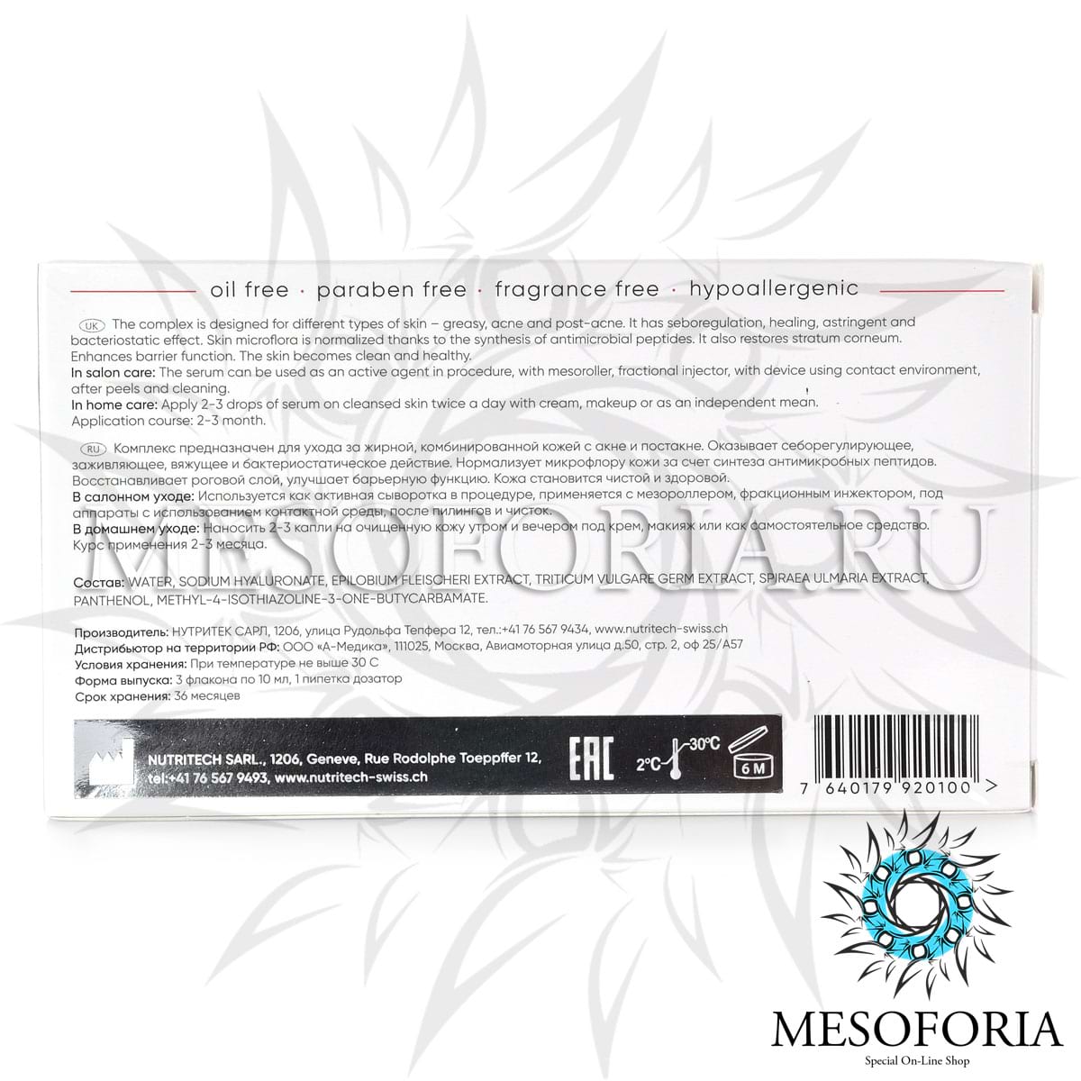 Оказывает себорегулирующее, заживляющее, вяжущее и бактериостатичекое действие. Нормализует микрофлору кожи за счет синтеза антимикробных пептидов. Восстанавливает роговой слой, улучшая барьерную функцию. Кожа становится чистой и здоровой. Не имеет возрастных ограничений. Для достижения наибольшего эффекта Вы можете использовать гиалуроновую кислоту с мезороллером или аппаратом фракционной мезотерапии.