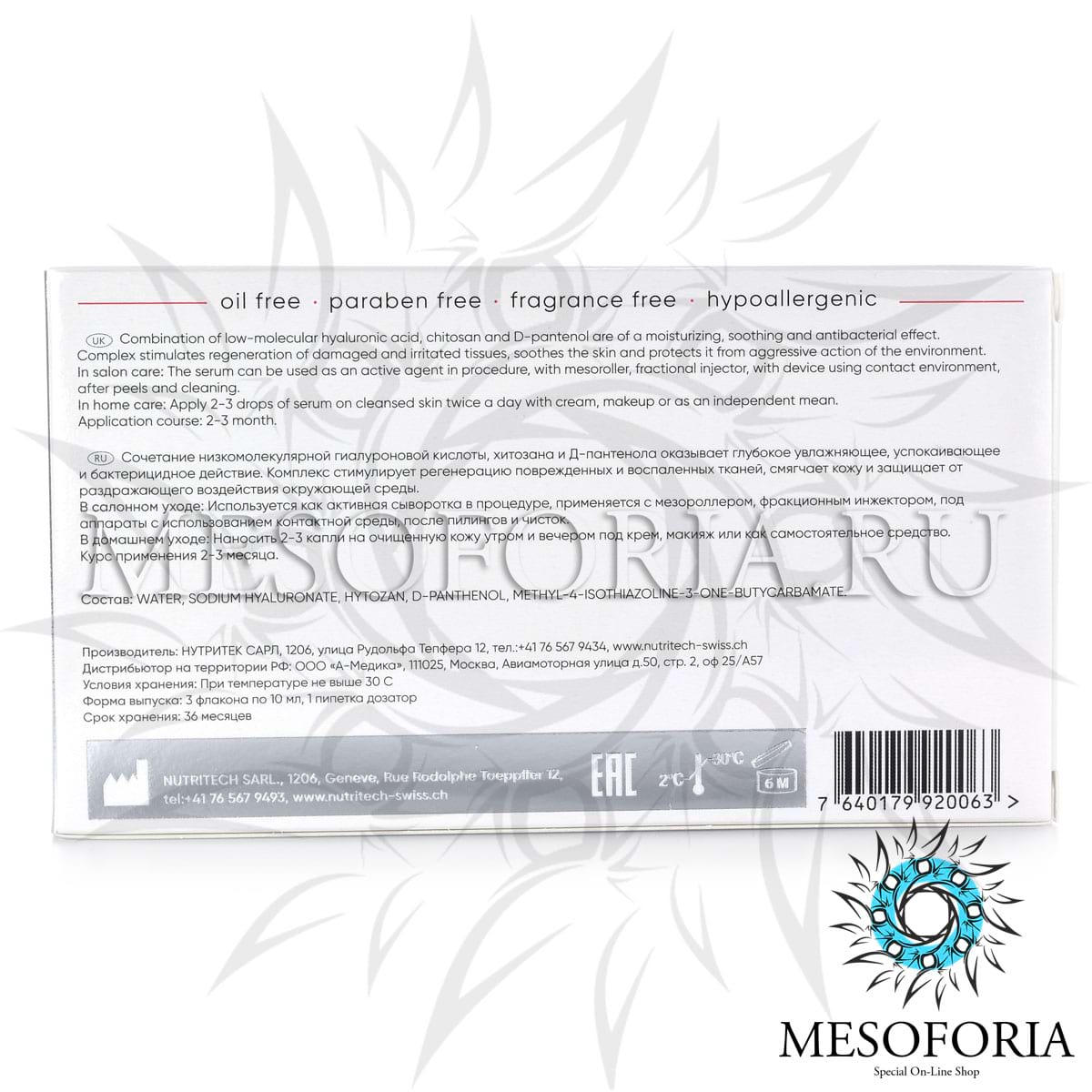 Сочетание низкомолекулярной гиалуроновой кислоты, хитозана и Д-пантенола оказывает глубокое увлажняющее, успокаивающее и бактерицидное действие. Комплекс стимулирует регенерацию поврежденных и воспаленных тканей, смягчает кожу и защищает от раздражающего воздействия окружающей среды. Без ограничений по возрасту. Для достижения наиболее качественного эффекта рекомендуется применение с мезороллером или аппаратом фракционной мезотерапи.