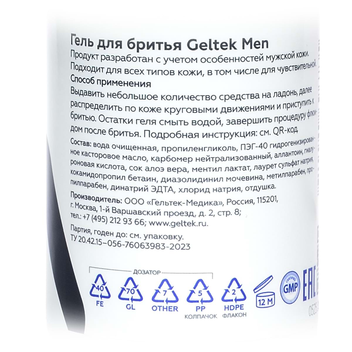 После очищения лица гелем для умывания Geltek Men равномерно распределить гель для бритья по влажной коже и произвести бритьё. Далее смыть остатки геля водой комфортной температуры, завершить процедуру флюидом для бритья.