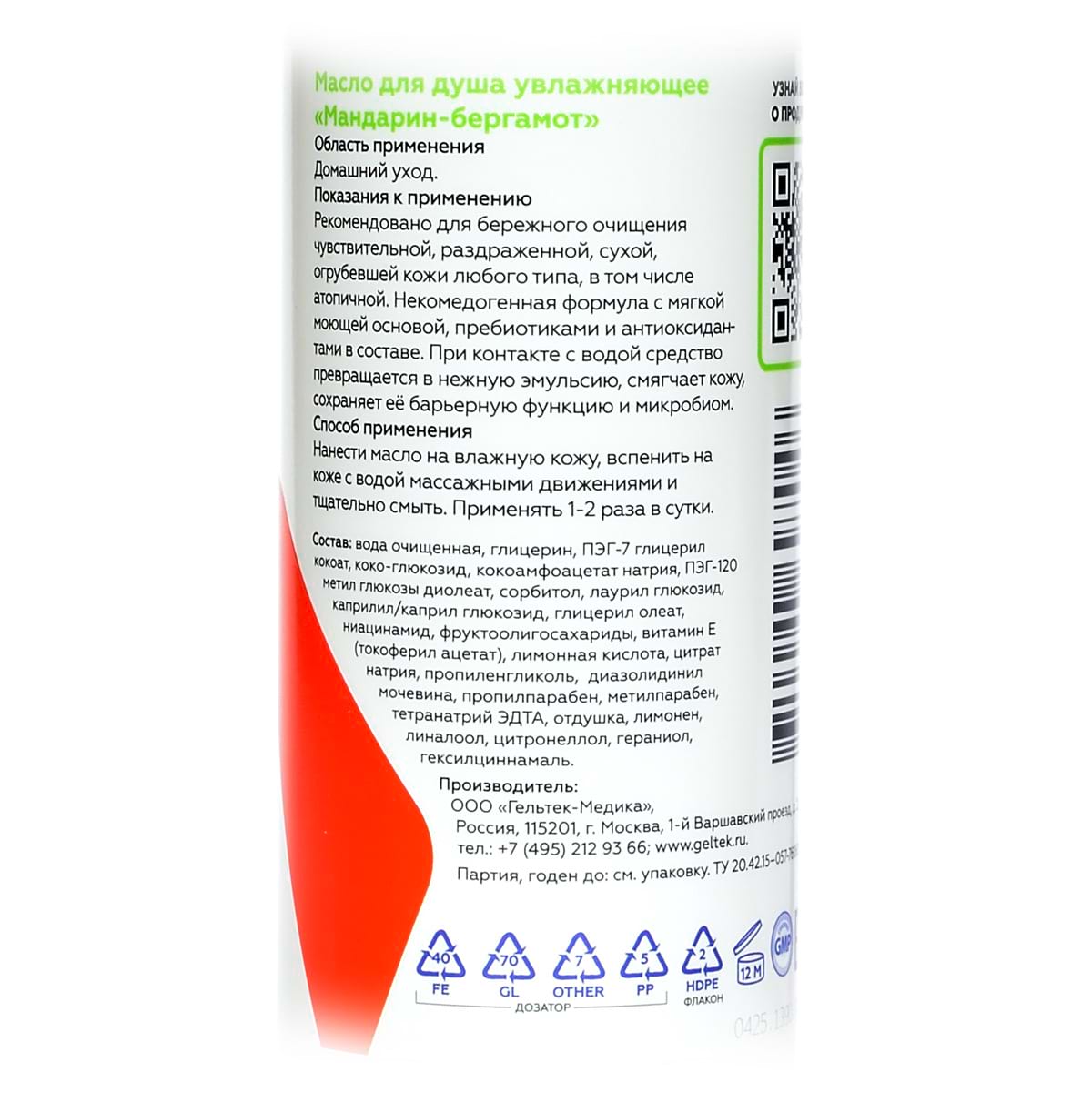 Масло для душа увлажняющее «Мандарин-бергамот» Geltek (Гельтек) - 240 мл