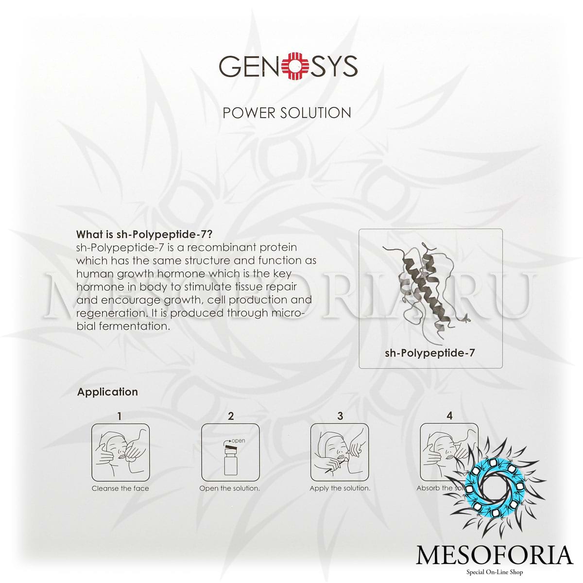 - Sh-полипептид-7. Рекомбинантный белок, обладающий той же структурой и функцией, что и человеческий гормон роста — ключевой гормон организма, стимулирующий репарацию тканей, рост, образование и регенерацию клеток. Производится посредством микробной ферментации. Эффективно проникает в кожу и стимулирует работу собственных стволовых клеток.