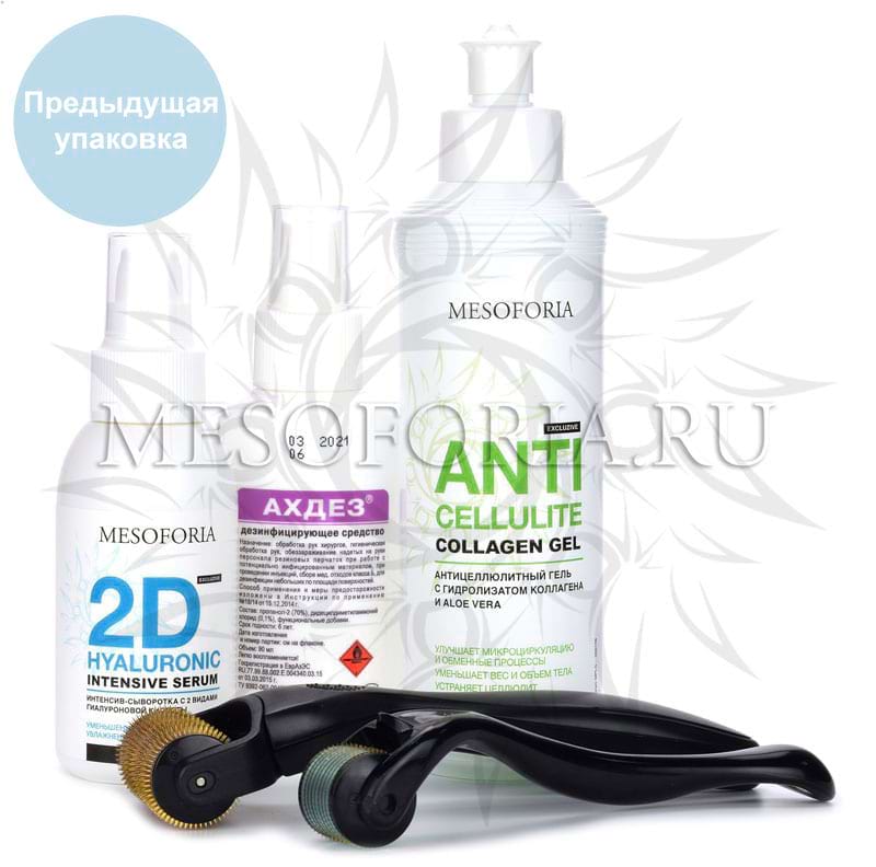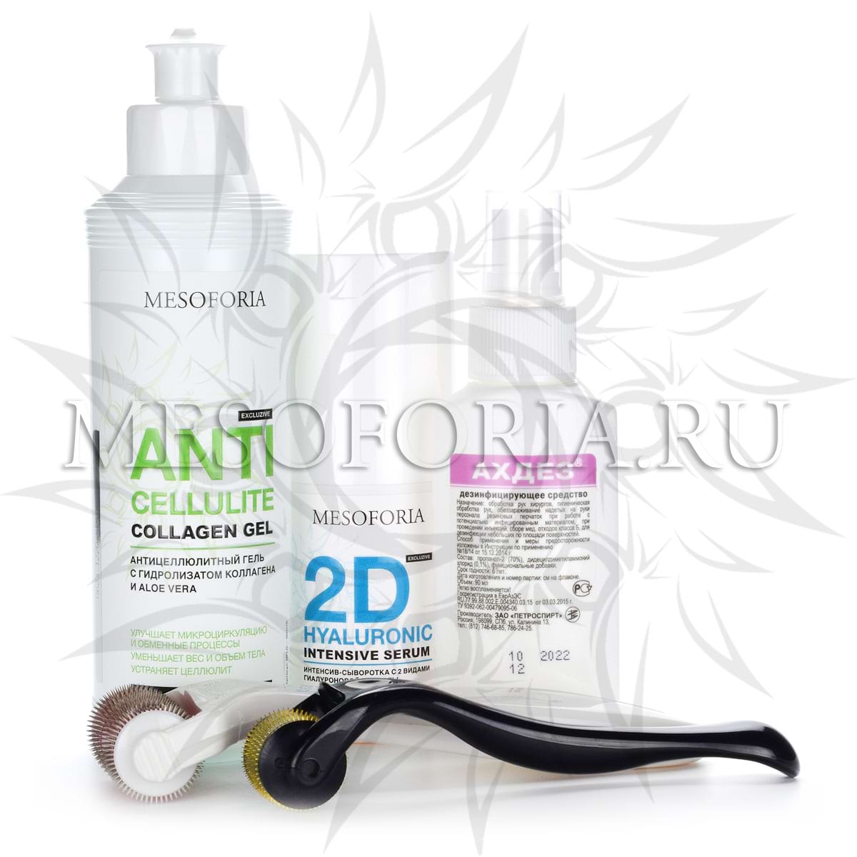 Набор с мезороллерами для лица и тела (лифтинг, морщины, целлюлит, растяжки), Интенсив-сыворотка с 2 видами гиалуроновой кислоты, гелем антицеллюлитным с гидролизатом коллагена и Aloe Vera и средством дезинфекции