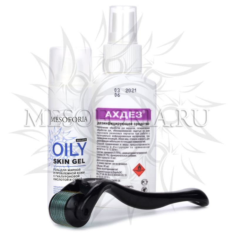 Набор с мезороллером для лица Dermaroller Dr Mezo (жирная кожа, акне, постакне), гелем для жирной и проблемной кожи с гиалуроновой кислотой и серой, 30 мл и средством дезинфекции - 2 мм
