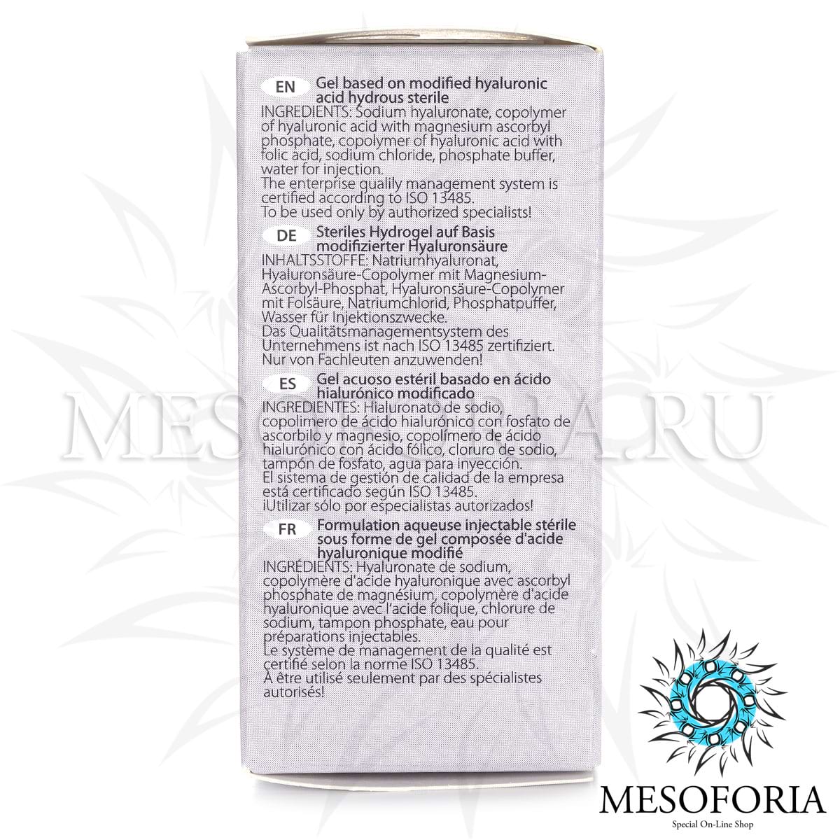 Благодаря уникальной технологии HYALREPAIR® technology активные вещества, входящие в его состав (гиалуроновая кислота, модифицированная твердофазным методом витамином С и фолиевой кислотой), удерживаются в коже в течение длительного времени, что обеспечивает пролонгированную стимуляцию клеточной активности и эффективно устраняет признаки гиперпигментации, повышает тонус и тургор кожи, а также позволяет успешно использовать данные препараты не только в классических инъекционных процедурах омоложения кожи, но и в программах системной биорепарации организма: очищение организма от токсинов и продуктов обмена веществ, восстановление работы пищеварительной системы, укрепление иммунитета, нормализация сна, при интоксикации (пищевой, лекарственной, алкогольной), аллергических заболеваниях; для повышения работоспособности и качества жизни.