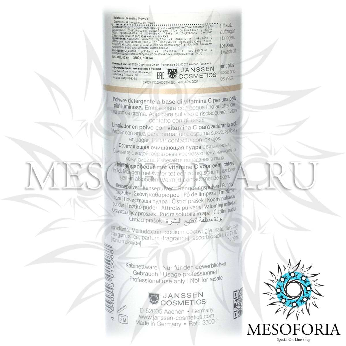 Melafadin Cleansing Powder от Janssen Cosmetics - это белая пудра с приятным ароматом, которая содержит чистый витамин С для эффективного осветляющего воздействия на кожу. При смешивании с водой пудра превращается в кремообразную пенку, и входящие в ее состав растительные активные компоненты легко и тщательно очищают поверхность кожи, удаляя загрязнения и макияж.