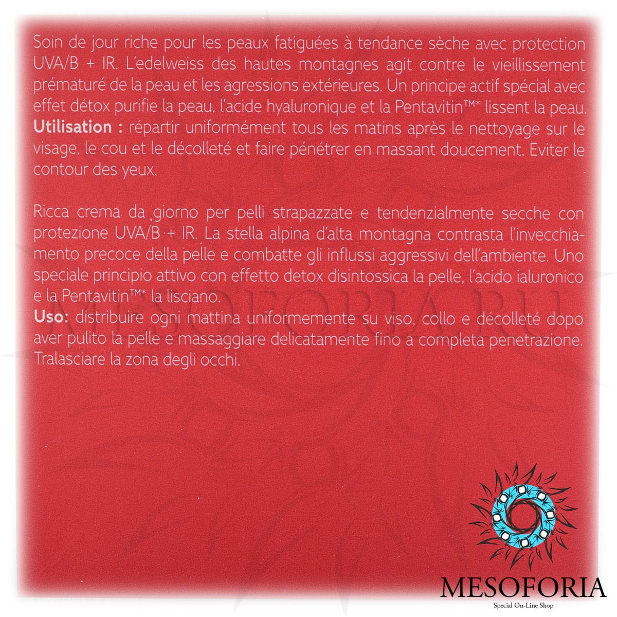 - Экстракт эдельвейса: улучшает динамические и эластические характеристики кожи. Активные фитосоединения в составе экстракта эдельвейса – бисаболен, ситостерол, дубильные вещества, хлорогеновая кислота, апигенин-7-глюкозид, лютеолин и 0,23% полифенольных соединений – предопределяют его уникальную способность улучшать барьерные свойства кожи и нивелировать вред свободных радикалов. Так доказано, что индекс антиоксидантной активности экстракта эдельвейса в косметике вдвое выше, чем у известного своими антиоксидантными свойствами витамина С. Благодаря своим защитным и смягчающим свойствам экстракт эдельвейса часто используется в косметике вместе с солнцезащитными фильтрами. Также он действует как ингибитор медиатора воспаления интерлейкина-5, демонстрируя выраженное противовоспалительное действие на кожу. Кроме того, экстракт эдельвейса подавляет активность ферментов (например, гиалуронидазу и 5-липоксигеназу, которые принимают участие в процессах старения кожи). Понижает ROS -69%. Окислительный стресс – состояние с повышением [ROS] (ROS = reactive oxygen species, активные метаболиты кислорода, активные формы кислорода) внутри клетки за счет усиления их генерации или уменьшения их удаления антиоксидантами. ROS очень активны, атакуют ДНК, РНК, белки, жирные кислоты с образованием новых свободных радикалов (R?). ROS образуются постоянно в митохондриях при дыхании, но разрушаются антиоксидантами. Уменьшает воздействие свободных радикалов -73%. Уменьшает перекисное окисление липидов -60%. Улучшает эластичность кожи.