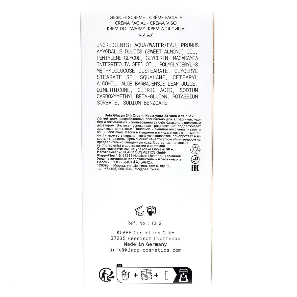 Крем-уход 24 часа для чувствительной кожи лица / 24H Cream, Beta Glucan, Klapp (Клапп) - 50 мл