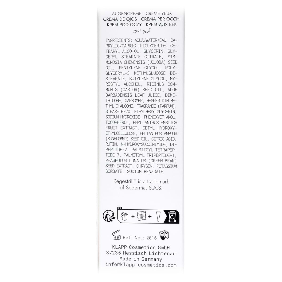 Интенсивный крем для век для комплексного воздействия на общее состояние и внешний вид кожи периорбитальной области. Regestril™ в сочетании с геспередин метил халкон и дипептидом-2 не только уменьшает выраженность морщин и подтягивает кожу, но и устраняет пастозность и выраженность мешков под глазами, делает темные круги менее заметными, помогает вывести из кожи век излишки пигментов. Это делает кожу век более светлой и ровной.