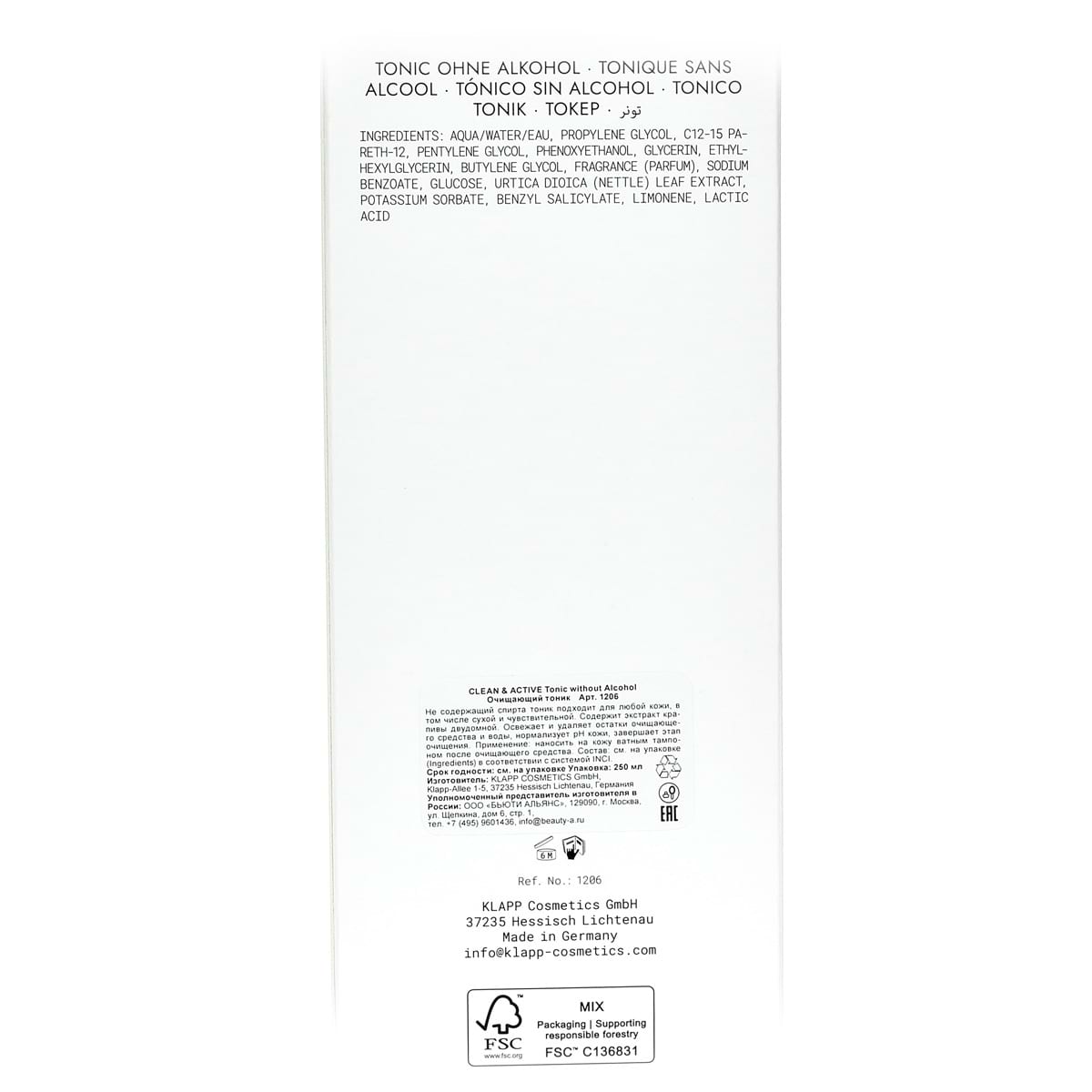 Очищающий тоник без спирта для лица / Tonic Without Alcohol, Clean & Active, Klapp (Клапп) - 250 мл