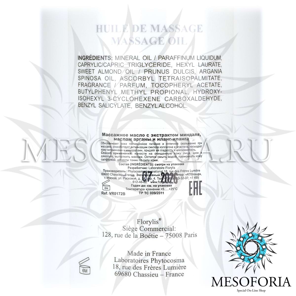 Массажное масло с экстрактом миндаля, маслом арганы и иланг-иланга / Huile de massage, Florylis (Флорилис) - 600 мл