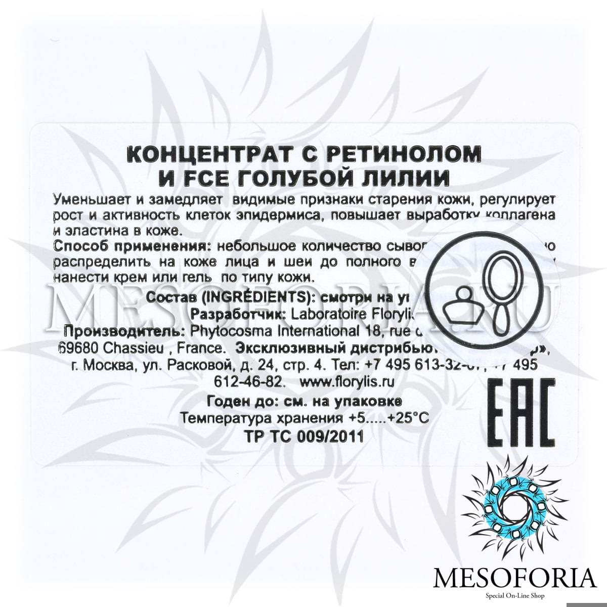 Способ применения: Сыворотку концентрат с ретинолом и FCE голубой лилии Florylis равномерно нанести на очищенную кожу самостоятельно или под крем Florylis по типу кожи. Обязательно нанесение защитного увлажняющего крема с SPF 40 Florylis в дневное время суток.