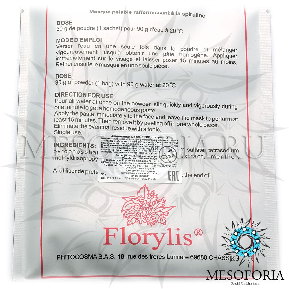 Альгинатная маска со спирулиной / Masque Pelable Raffermissant A La Spiruline, Florylis (Флорилис) - 30 гр
