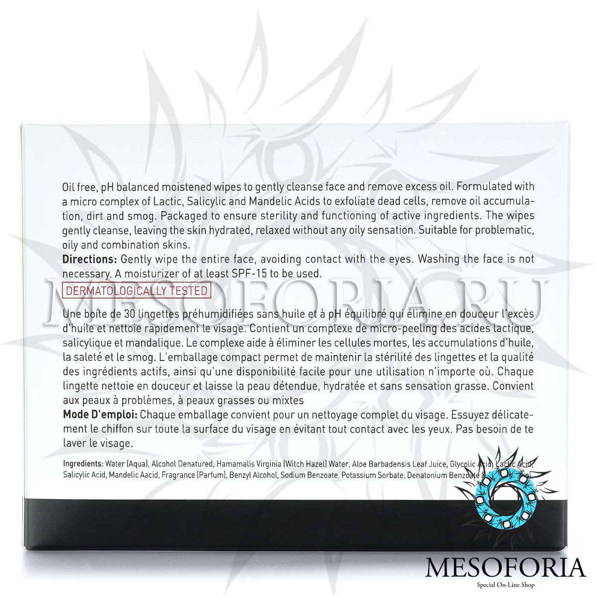 Одноразовые салфетки в индивидуальной упаковке для быстрой очистки лица. Салфетки содержат набор активных кислот: гликолевую, молочную, салициловую, миндальную и экстракты гамамелиса и алоэ-вера.