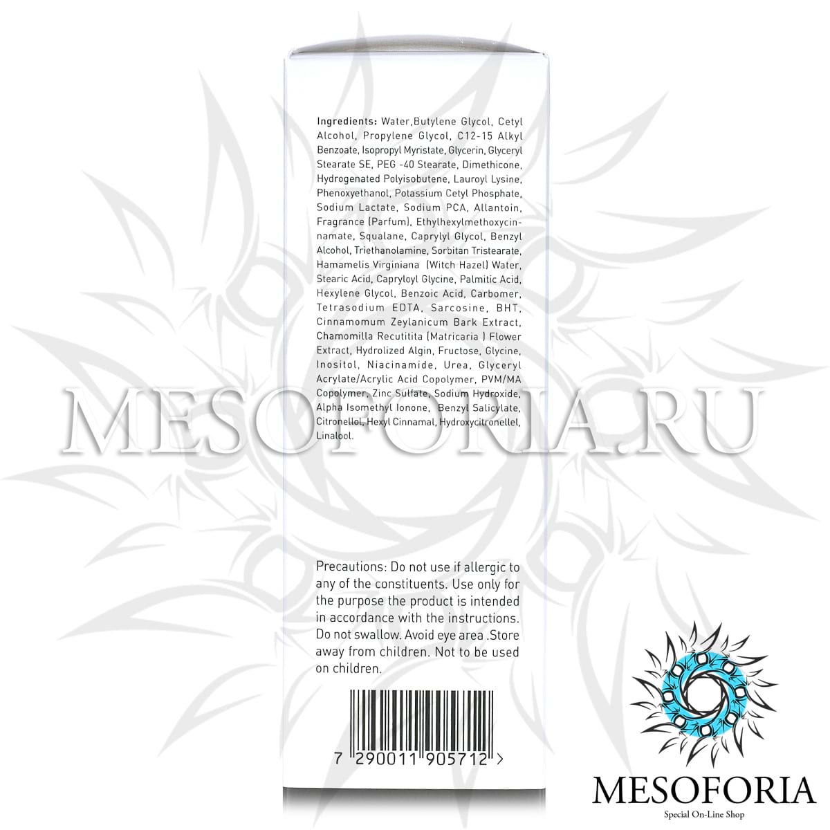 Экстракт гамамелиса, экстракт ромашки, аллантоин, сквален, экстракт корицы, фруктоза, глицин, инозитол, ниацинамид, мочевина, сульфат цинка.
