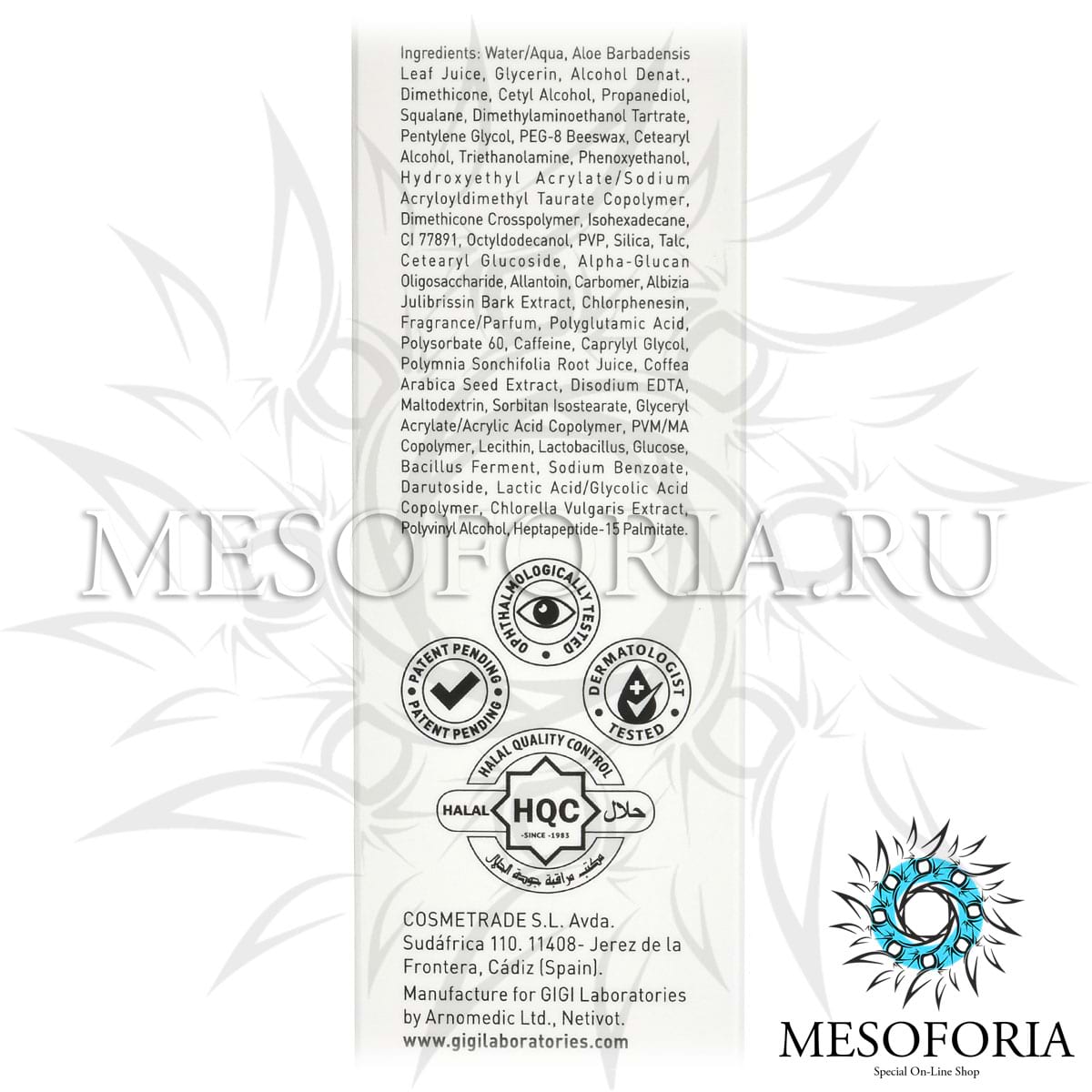 ДМАЕ, полиглутаминовая кислота, экстракт корня якона, экстракт кофейных зёрен арабики, экстракт алоэ, экстракт коры персидского шелкового дерева, лактобактерии, пробиотики, пептиды, экстракт хлореллы, дарутозид, комплекс молочной и гликолевой кислот, пропилен гликоль, диоксид титана, аллантоин.