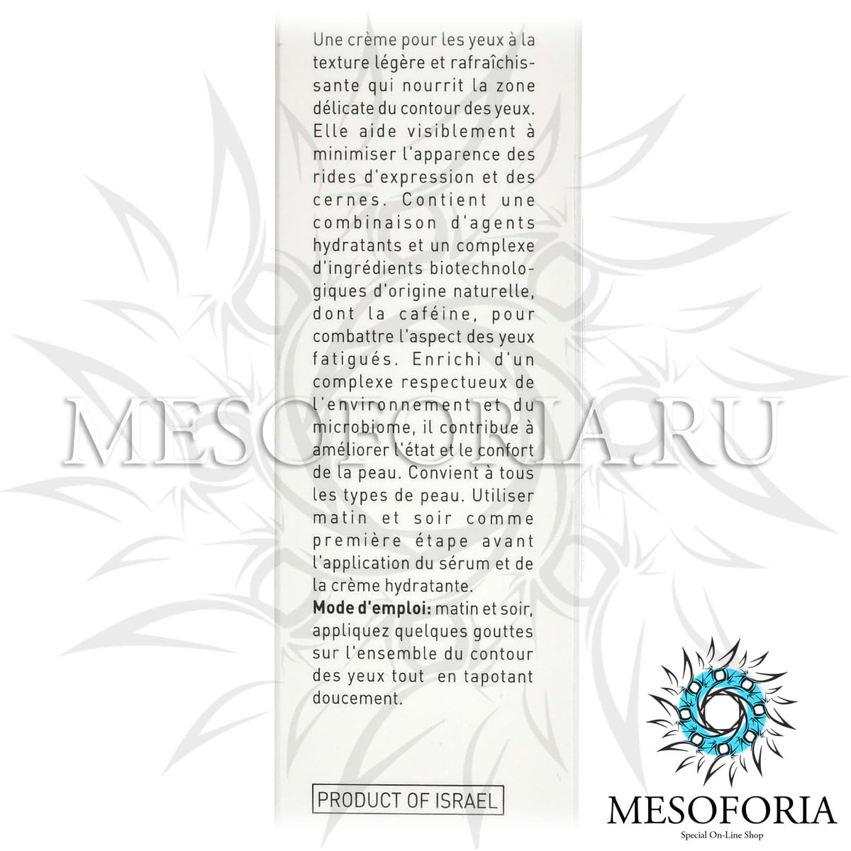 Крем для зоны глаз легчайшей текстуры, предотвращает появление мимических морщин и способствует осветлению темных кругов. Содержит комбинацию гидратантов, витаминов, кофеина и комплекс биотехнологических компонентов природного происхождения, создающих защитную систему, препятствующую образованию морщин и потере природной влаги.