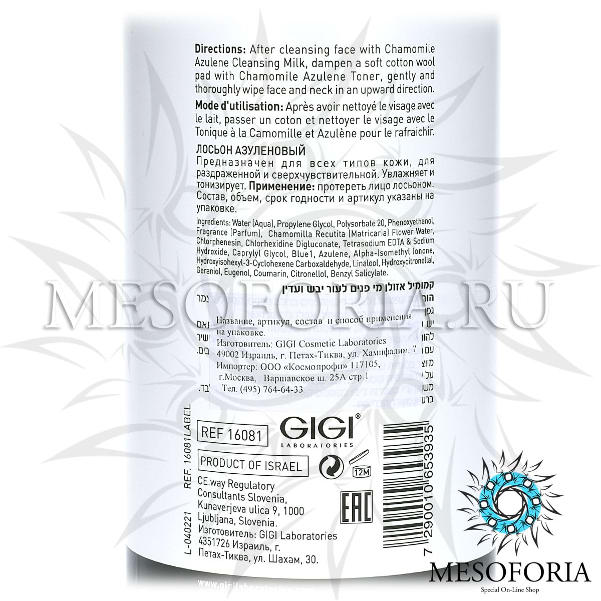 Используется Skin Expert Azulen lotion GiGi для очищения и тонизирования кожи в салонных процедурах.