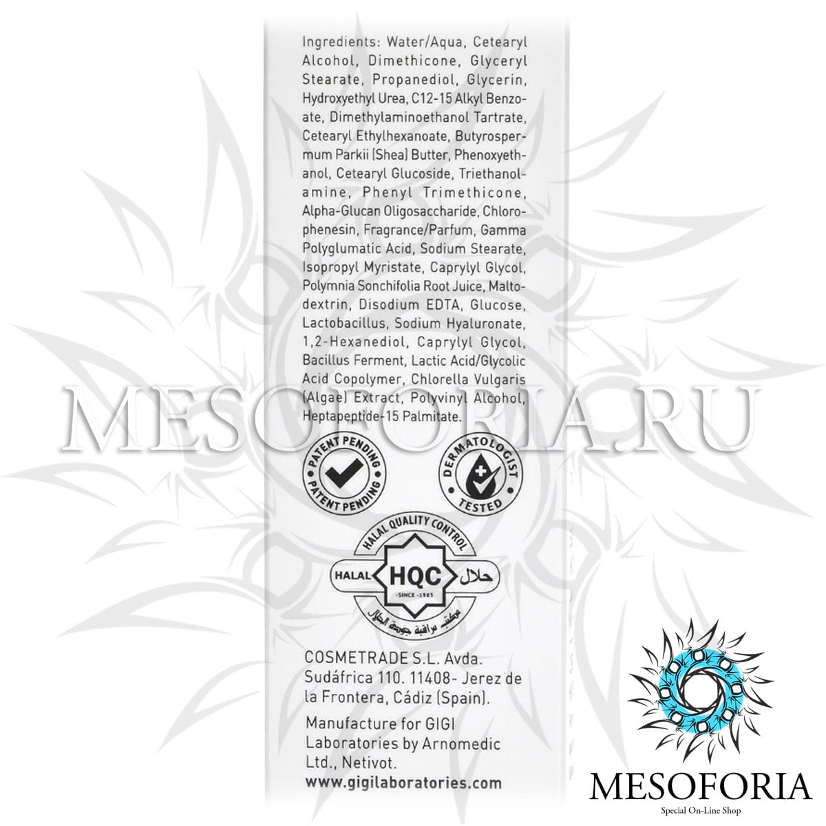 ДМАЕ, масло Ши, Poly-g-Glutamic Acid, сок корня якона, мальтодекстрин, глюкоза, лактобактерии, пробиотики, комплекс молочной и гликолевой кислот, пептиды, экстракт хлореллы, мочевина, глицерин.
