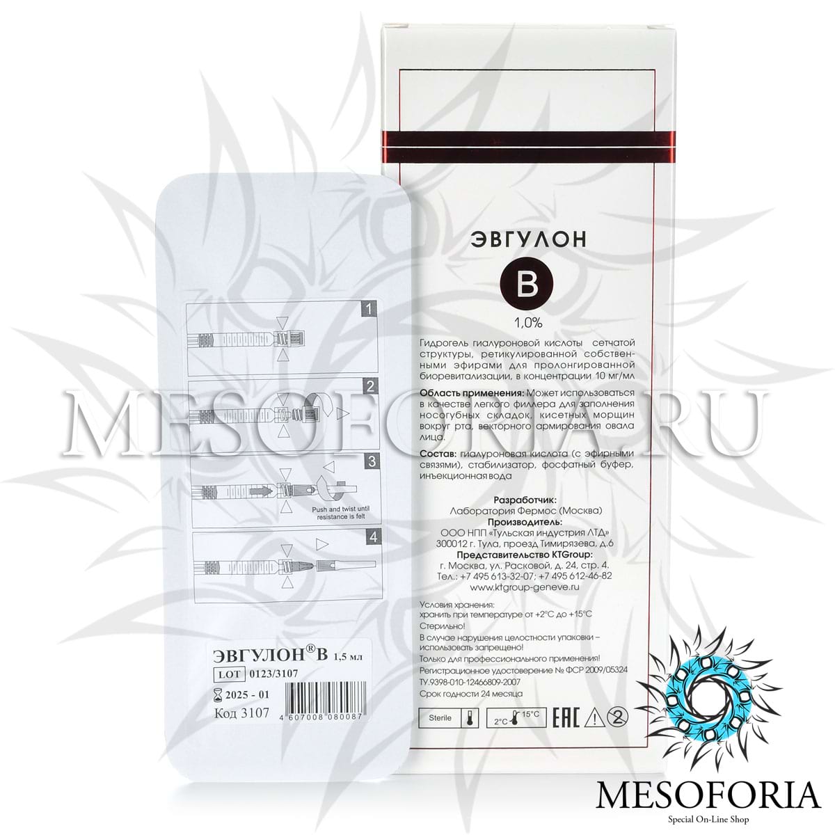 - 1 шприц содержит 10 мг гиалуроната Na, (молекулярная масса 2,5 млн. Дальтон).